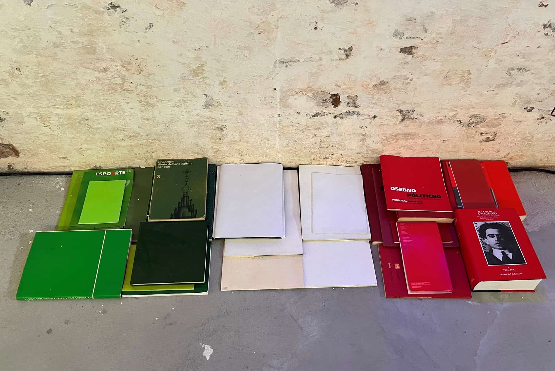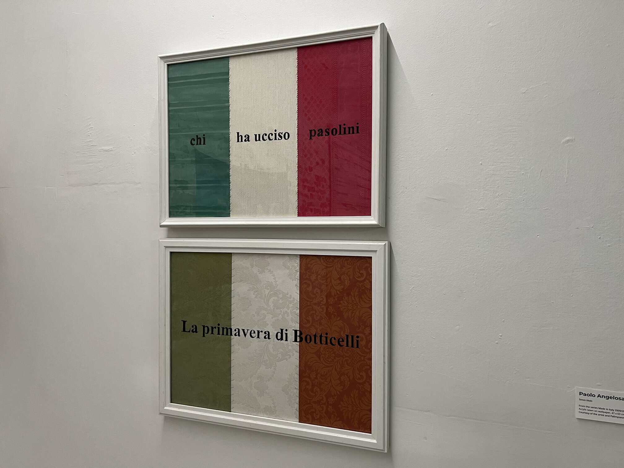 La stessa bandiera italiana è stata diversamente utilizzata dai singoli artisti, ad evidenziare la questione identitaria come codice semantico. Se ne appropria Paolo Angelosanto con Chi ha ucciso Pasolini, in un’opera a metà tra lo stereotipo e la giungla mediatica; la reinterpreta Paolo Toffolutti nella sua Installazione: un tricolore fatto di libri bianchi, rossi e verdi posati semplicemente a terra, quasi fossimo al mercato. L’artista ci invita a osservare, valutare e scegliere, in una riflessione sui simboli e, perché no, sul consumo culturale.