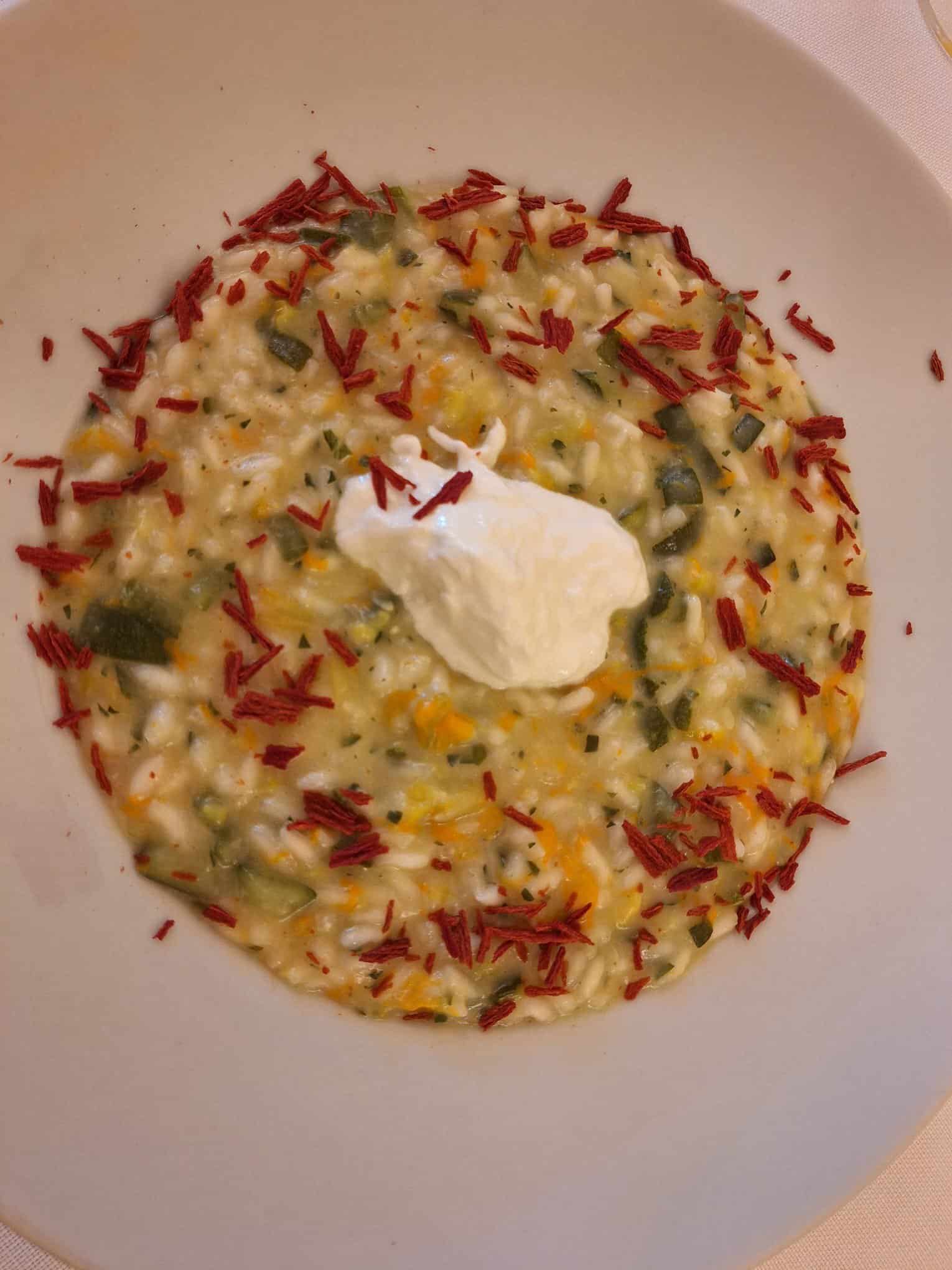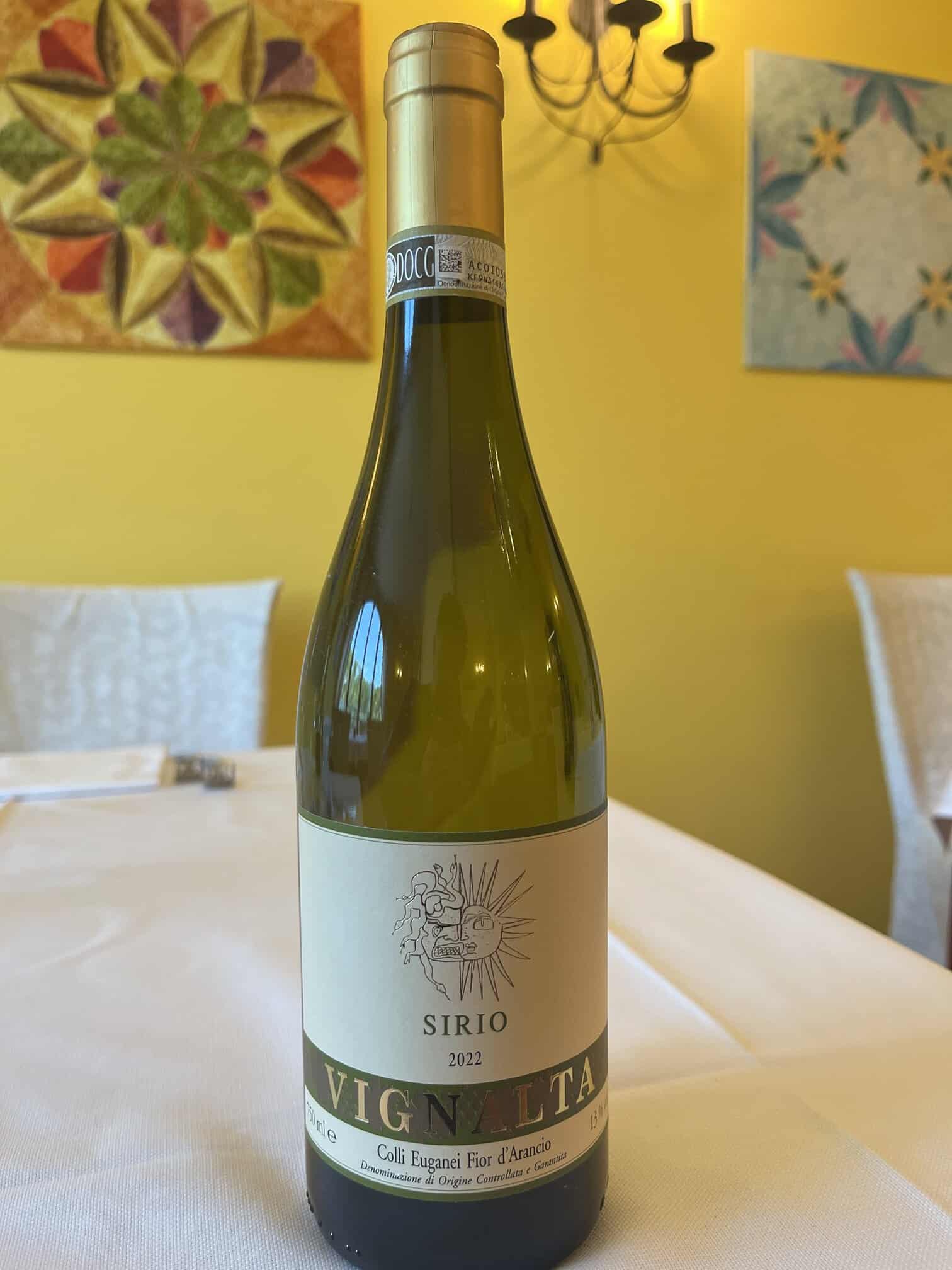 Non poteva mancare un vino autoctono, quello della famosa cantina Vignalta, a qualche chilometro dal Ristorante Il Canzoniere. Davide ha scelto, come abbinamento, il Sirio annata 2022, un Colli Euganei Fior D’Arancio secco DOCG, 13 gradi. Un fresco biologico, dalla giusta mineralità e sapidità, adatto a un buon risotto.