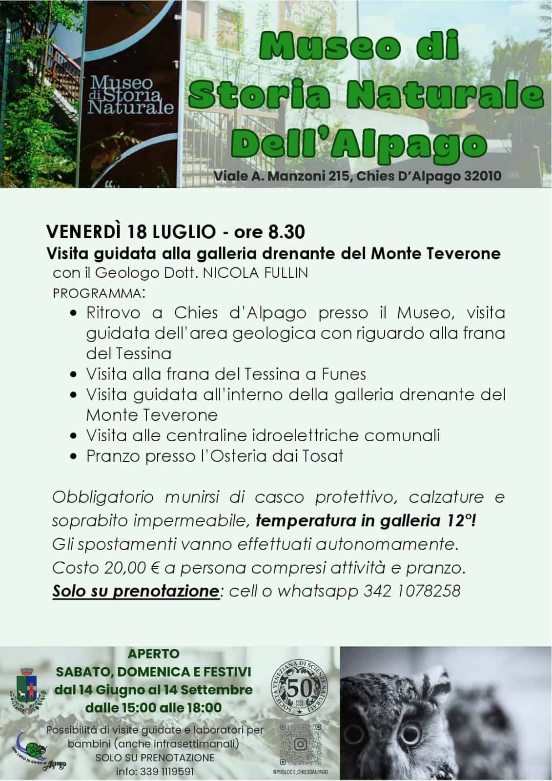 Inizia al Museo di Storia naturale dell’Alpago la visita guidata dal geologo Nicola Fullin alla frana del Tessina e alla Galleria drenante del Monte Teverone, venerdì 18 luglio prossimo. Ritrovo alle 8.30 all’ingresso del museo in viale Manzoni a Chies dove si potrà prendere visione, grazie all’allestimento di un’area dedicata, di un primo inquadramento dell’orografia del territorio e del movimento franoso. Si passerà poi sul campo, il località Funes ai piedi del corpo di frana, dal quale si possono individuare chiaramente anche i distaccamenti più recenti.