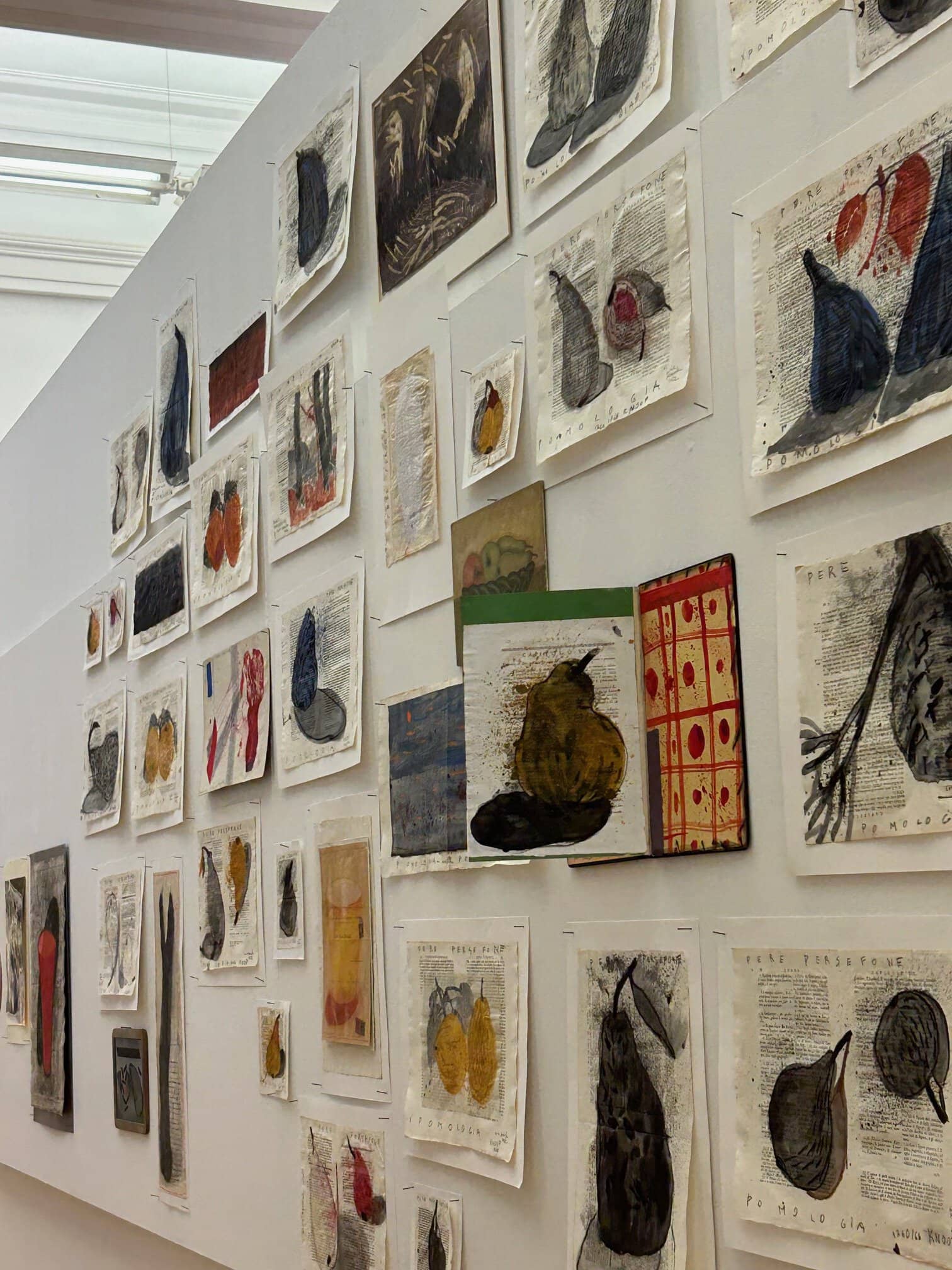 A Palazzo Zuckermann, nel centro di Padova, giusto in faccia agli Eremitani, fino a metà settembre: qui è ospitata Botanikum, la prima mostra dell’artista Lucia Pescador in un’istituzione pubblica italiana. Mi ci reco in pellegrinaggio, spesso: sta tutta in una grande sala, le pareti fitte di fogli volanti, tenuti su con gli spilli, in un horror vacui che ricorda quello del suo affascinante appartamento milanese. Una camera delle meraviglie, tutta dedicata al rapporto con la natura; racconti di foglie, fiori, frutti, legni e funghi. Circa cinquecento opere, in prevalenza disegni su carta, acetati, fotografie, collages, create appositamente per questo spazio magico.