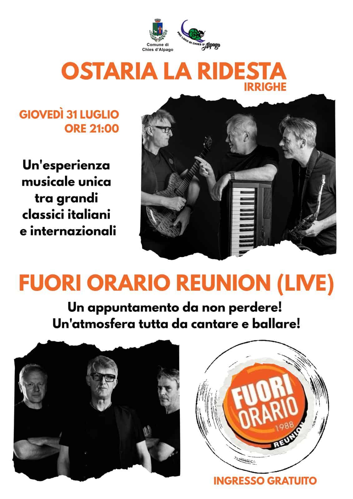 Il primo appuntamento con la musica live giovedì 31 luglio con “Fuori Orario Reunion” alla Ostaria La Ridesta
