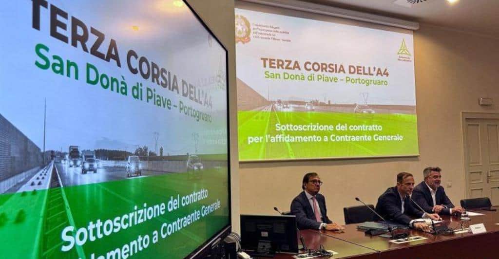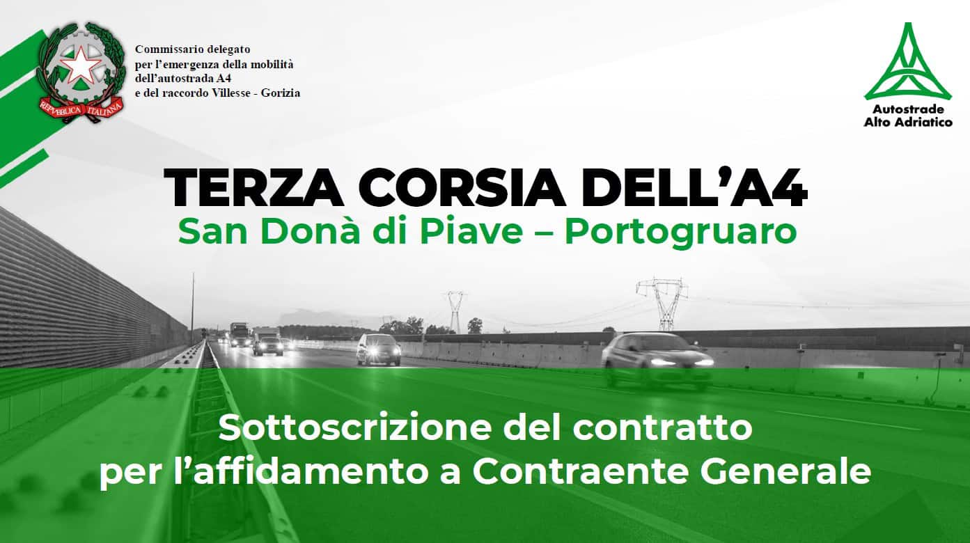 Il bando per la progettazione esecutiva e la costruzione dell’ampliamento con la terza corsia della A4 (Venezia – Trieste), nel tratto di 25 chilometri tra Portogruaro e San Donà di Piave della rete autostradale di Autostrade Alto Adriatico, è stato aggiudicato al Consorzio Stabile Eteria (Vianini Lavori S.p.a, Itinera S.p.a e I.Co.P S.p.a). La firma del contratto di affidamento si è tenuta ieri a Trieste nella sede della Autonoma Friuli-Venezia Giulia.