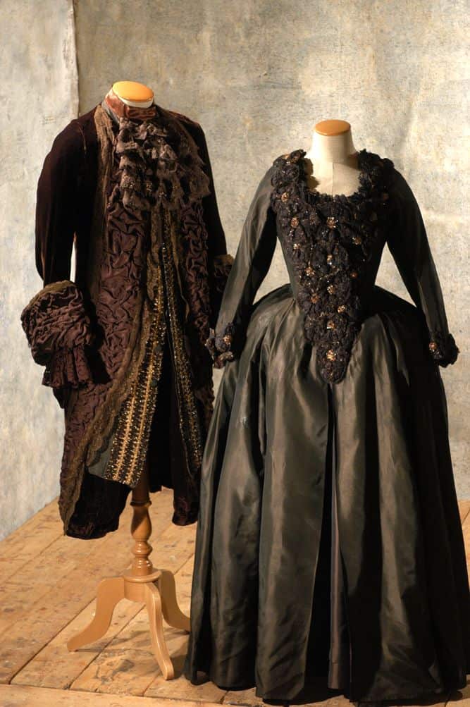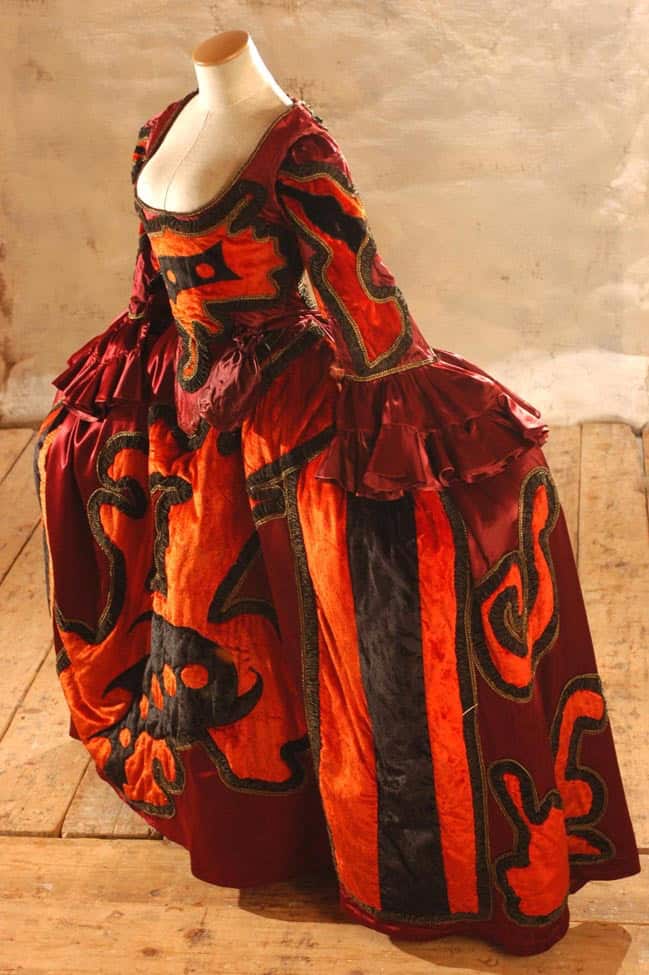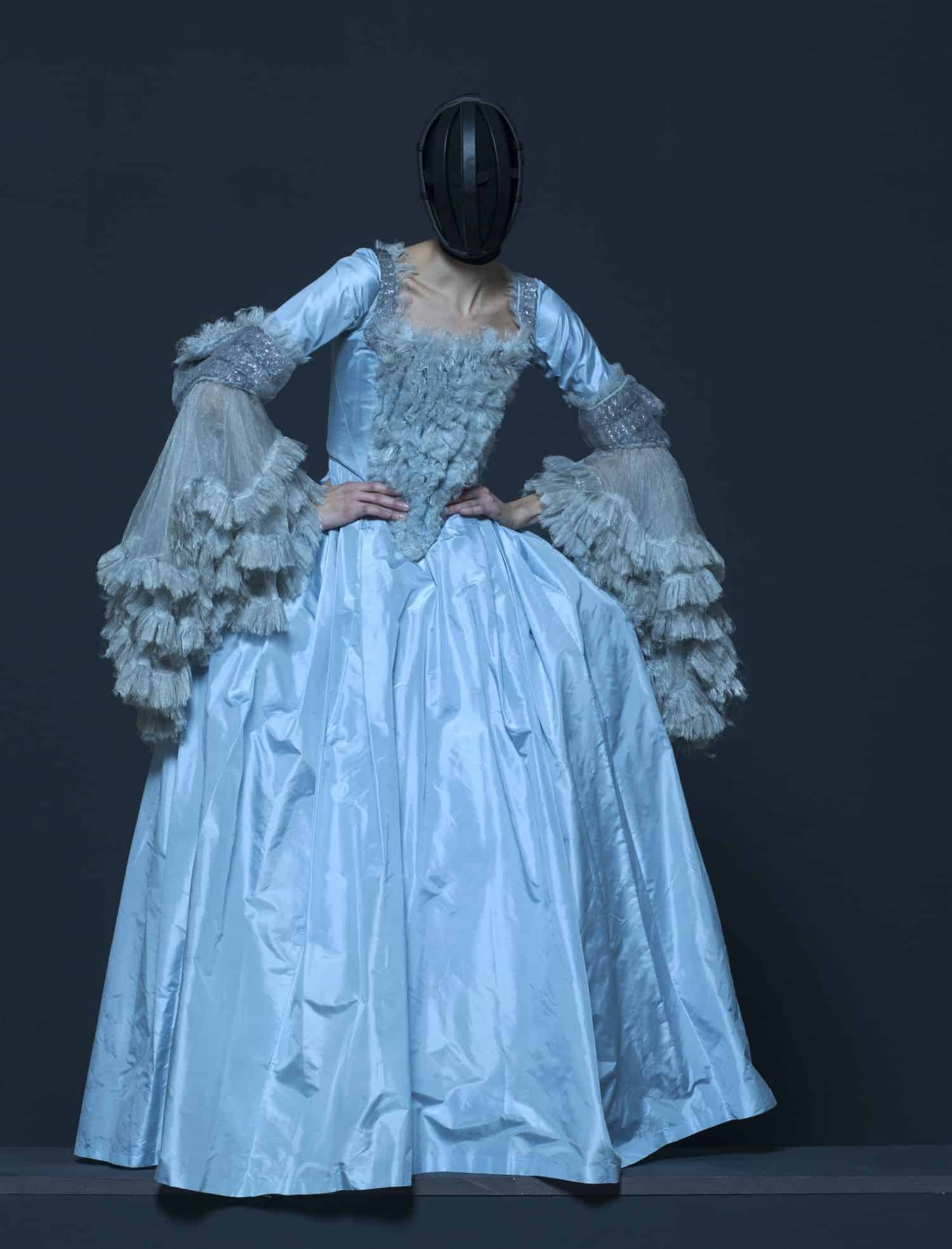 I sei pezzi originali in mostra, confezionati dalla storica Sartoria Teatrale Farani e oggi parte del loro archivio, sottolineano la convivenza, nello stesso film, di mondi diversi, frutto delle fantasie oniriche e surreali di Fellini in cui Danilo Donati esaspera il gusto per l’esagerazione e il grottesco dello stile rococò. Enfatizzando, talvolta trasfigurando in funzione critica, le già eccessive mode del tempo. Le silhouette volumizzate, i merletti strabordanti e i tessuti sontuosi trasformano così i personaggi in maschere del desiderio, della decadenza e della solitudine.