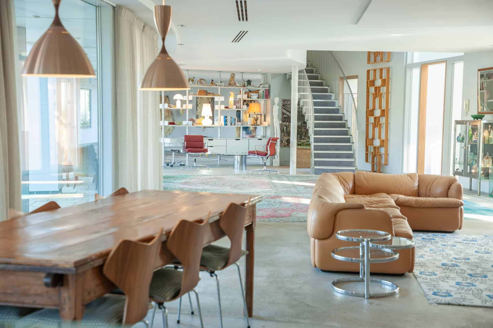 Dopo la Guerra Fredda, lo studio di architettura Norman & Dawbarn è stato incaricato di trasformare la proprietà in una casa luminosa e spaziosa, che ora dispone di sei camere da letto e bagni e di una superficie abitabile su due piani che copre ben 937 metri quadrati. Gli architetti, noti per le loro costruzioni brutaliste e progetti come il BBC Television Centre a White City, hanno dato forma a questa casa familiare con una serie di elementi unici. L’edificio principale, a forma di mezzaluna, forma un cerchio con il muro di cemento dell’antico serbatoio dell’acqua, creando al suo interno un giardino privato perfettamente appartato. Richiamando il passato della struttura, la casa ha un tetto in rame, mentre l’uso abbondante di vetro e tocchi di alluminio, come la scala a chiocciola, conferiscono alla casa un aspetto contemporaneo, quasi futuristico.