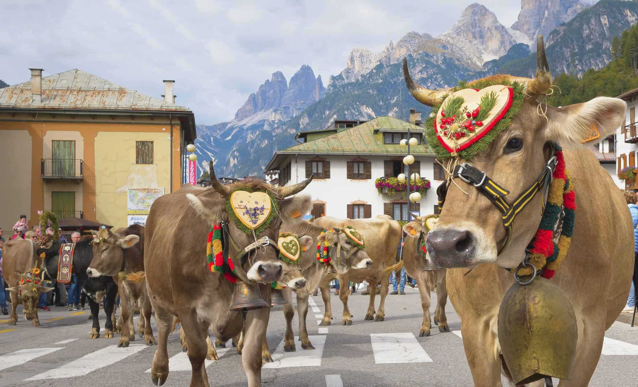 Le mucche vestite a festa sono le grandi protagoniste della festa e sfilano orgogliose per le strade guidate dai loro amati pastori. La regina apre il corteo, ogni tanto si ferma per guardarsi intorno stupita da tanta ammirazione, per poi proseguire la via, seguita da tutte le altre. Oltre alle mucche sfilano i pastori con i cani, e poi pecore, capre, cavalli. È uno spettacolo davvero imperdibile e coinvolgente, che mette al centro la vita pastorizia e l’importanza del bestiame.