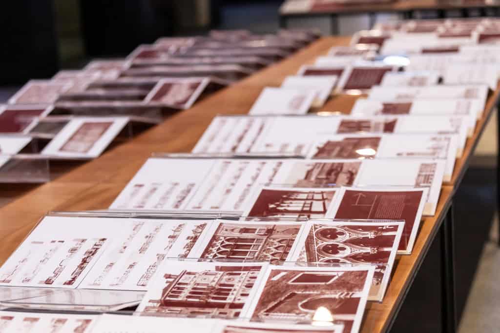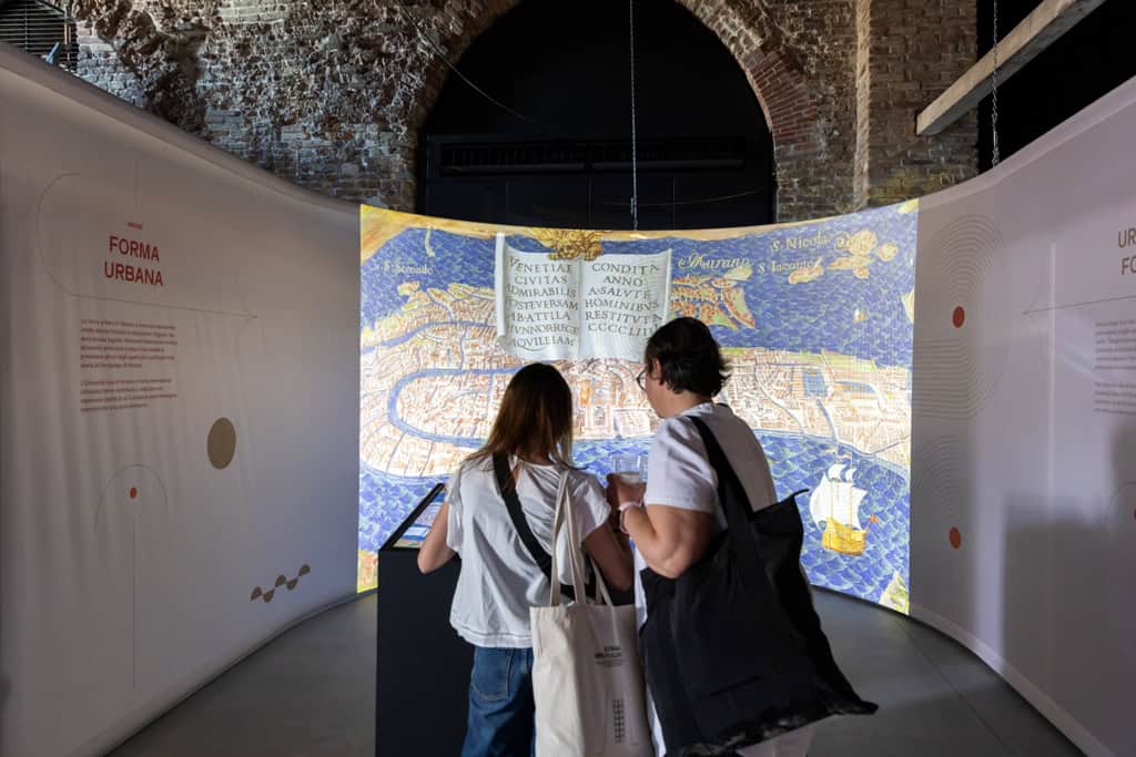 Le installazioni occupano la Tesa dell’Isolotto, sulla Darsena Grande dell’Arsenale, unico superstite di 18 squeri trecenteschi demoliti nel 1880. Ed è costruita con una successione di absidi, pannelli verticali ed una spina centrale rappresentata da un lungo tavolo. L’allestimento si estende su una superficie di 500 metri quadrati e include oltre 5000 immagini d’archivio. Più di 1000 mappe storiche provenienti dalle più autorevoli banche dati; oltre 3 ore di proiezioni video; 5 pannelli multimediali interattivi