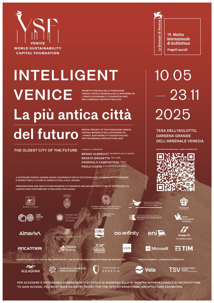 L’esposizione “Intelligent Venice”, che rientra nelle iniziative della Biennale della Sostenibilità di VSF, è a cura di Benno Albrecht (Università Iuav di Venezia), Renato Brunetta (VSF e CNEL), Pierpaolo Campostrini (CORILA), Paolo Costa (C+3C Sistemi e Strategie).