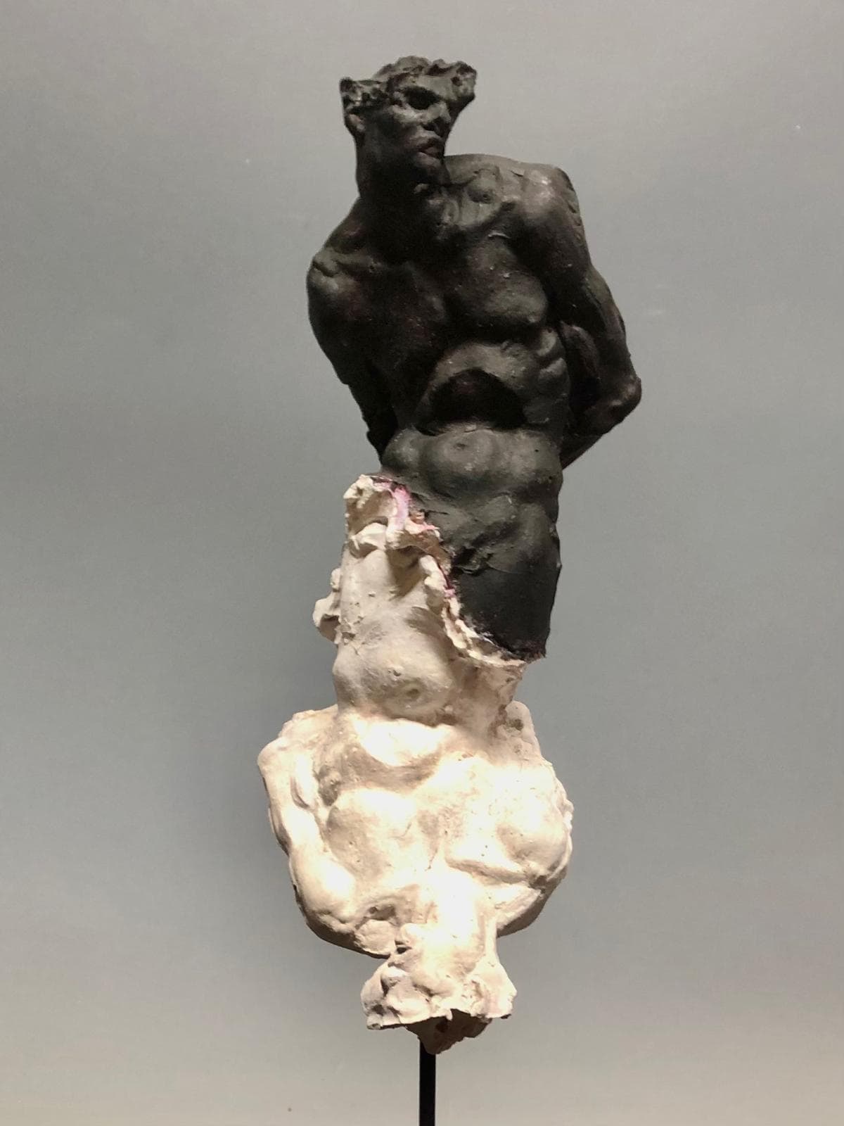 Greco è uno scultore “vecchio stampo”: lavora argilla, cera e gesso con le mani, rifacendosi alla tradizione di Michelangelo, Bernini, Rodin. Nelle sue opere il corpo umano, spesso ispirato alla mitologia, è colto in torsioni e tensioni emotive che rimandano al dramma e alla passione. Per l’occasione ha creato nuove sculture in bianco e nero, concepite come risposta visiva alle fotografie di Carmeni, in un gioco di luci e ombre che unisce plasticità e immagine.