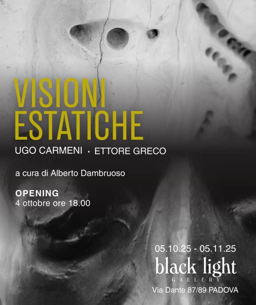 La Black Light Gallery di Padova ospita, da sabato 4 ottobre, la mostra Visioni Estatiche, un progetto che mette in dialogo due artisti veneti di grande intensità espressiva: il fotografo Ugo Carmeni e lo scultore Ettore Greco, sotto la curatela del critico d’arte Alberto Dambruoso. L’esposizione raccoglie un nucleo di lavori che testimoniano percorsi diversi ma sorprendentemente affini, capaci di incontrarsi nella tensione tra materia e immagine, tra permanenza e precarietà.