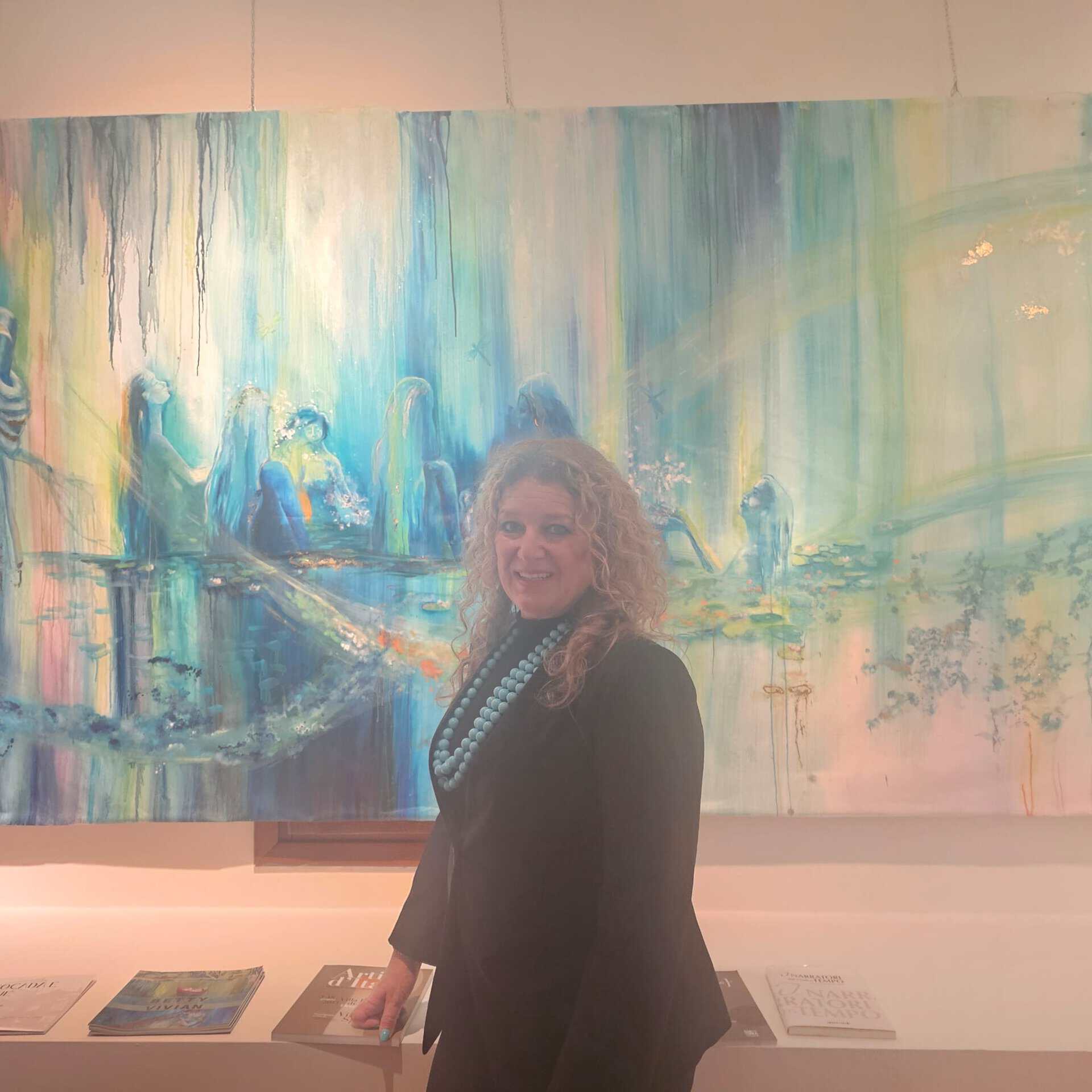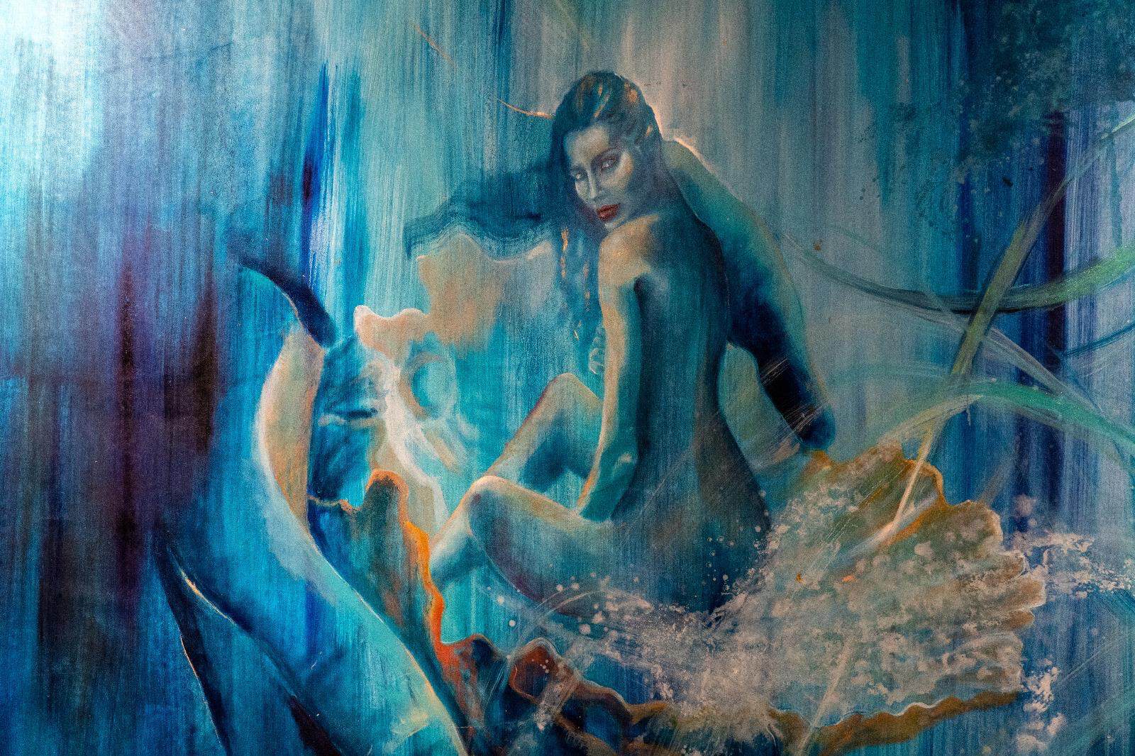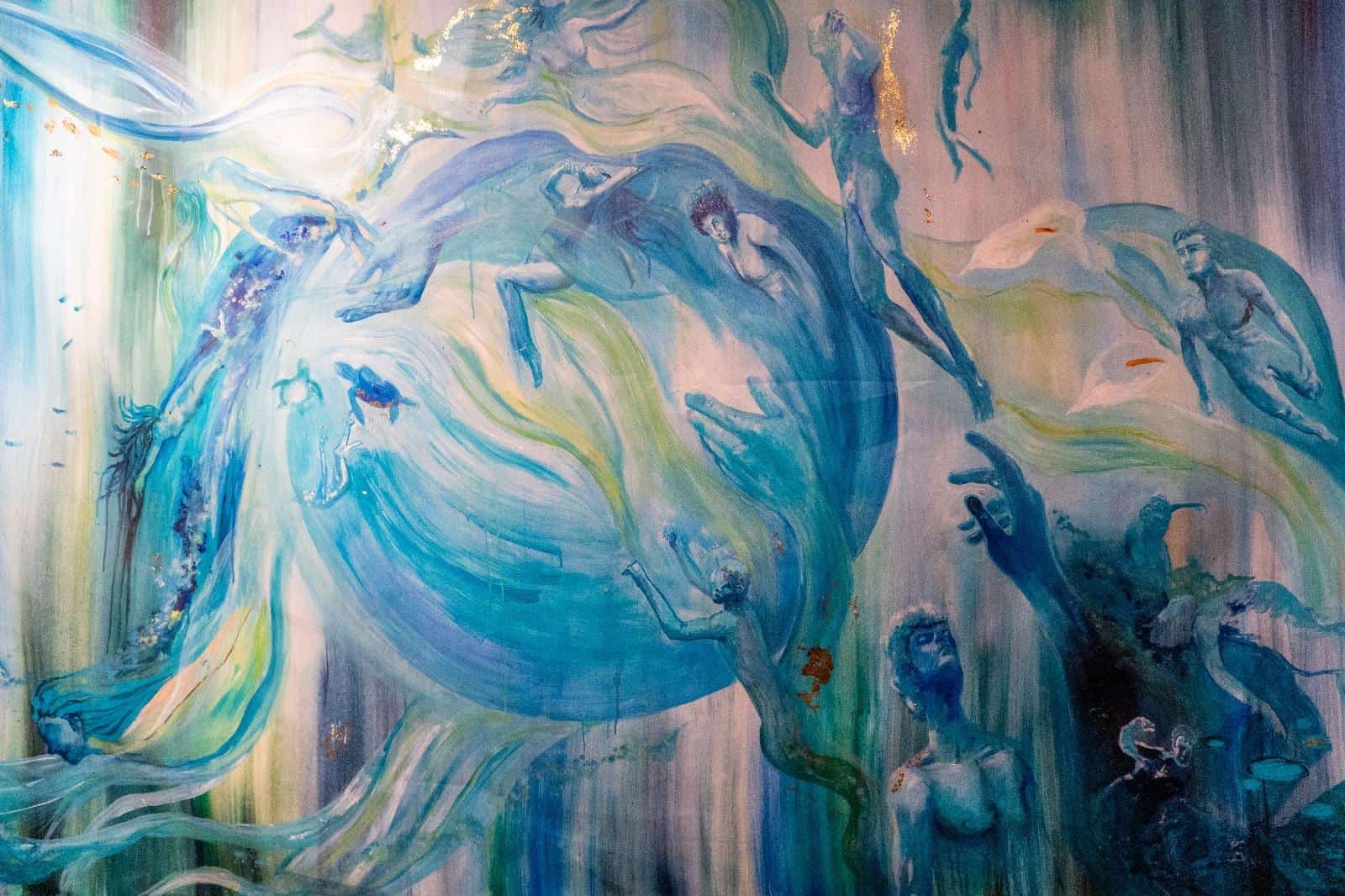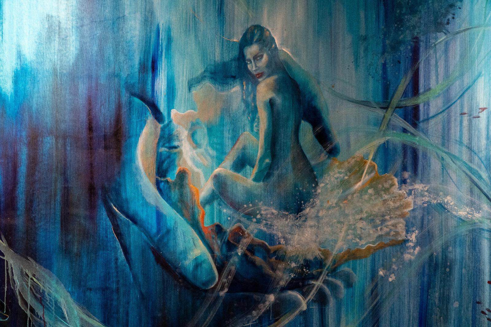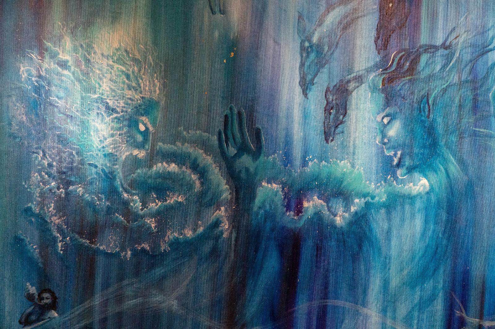 Profonda e coinvolgente la spiegazione dell’opera da parte dell’autrice e dello storico e critico d’arte Siro Perin: davanti a questa distesa pittorica, tutto comincia a scorrere, l’acqua diventa metafora della vita, della trasformazione, della memoria. Da Oceano e Teti fino a Ulisse, passando per Dafne, Aretusa, Narciso, le Nereidi, Scilla e Cariddi, ogni figura mitologica emerge e si dissolve in un paesaggio liquido, dove il blu, il turchese e il verde acqua si fondono in dissolvenze oniriche.