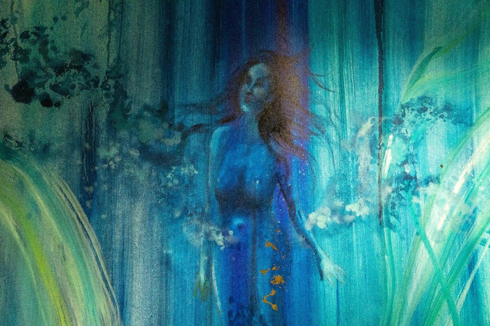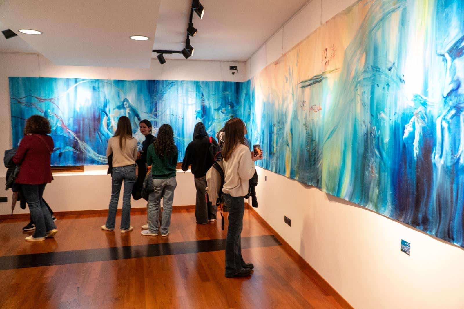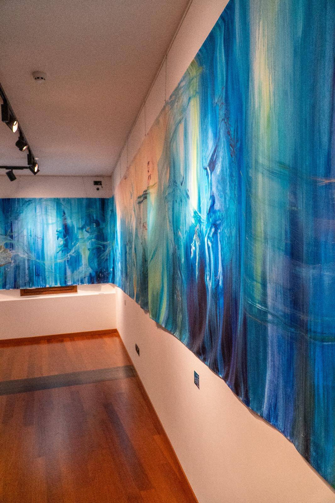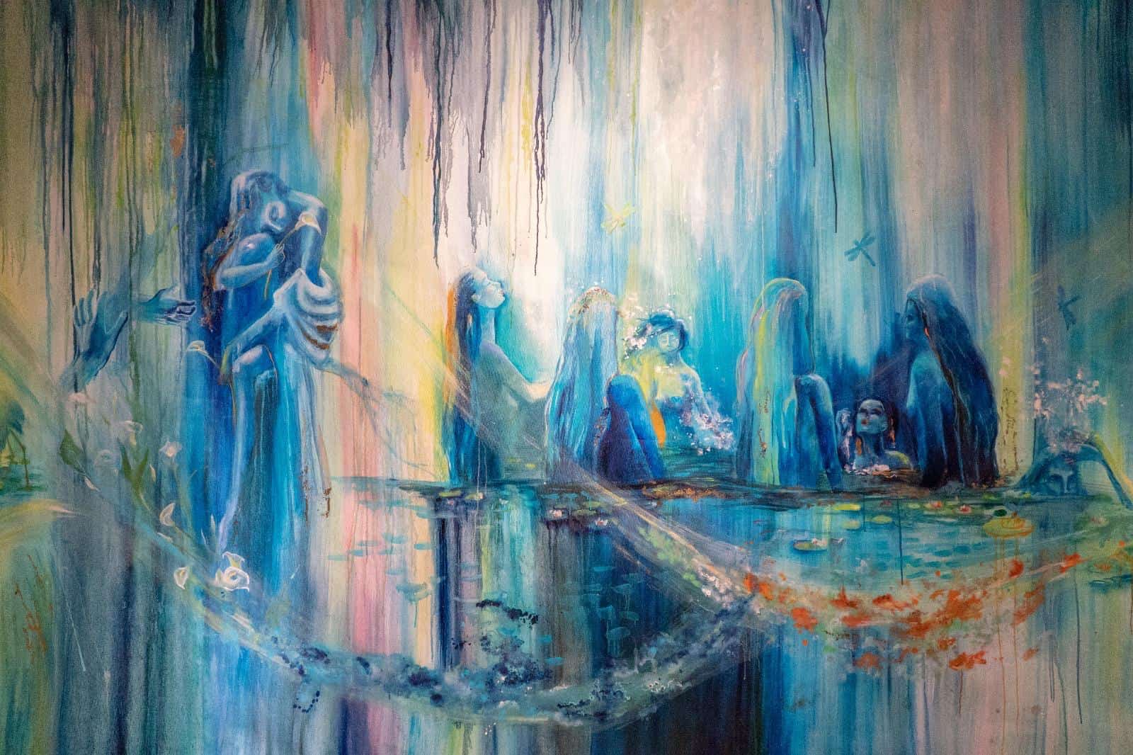 Profonda e coinvolgente la spiegazione dell’opera da parte dell’autrice e dello storico e critico d’arte Siro Perin: davanti a questa distesa pittorica, tutto comincia a scorrere, l’acqua diventa metafora della vita, della trasformazione, della memoria. Da Oceano e Teti fino a Ulisse, passando per Dafne, Aretusa, Narciso, le Nereidi, Scilla e Cariddi, ogni figura mitologica emerge e si dissolve in un paesaggio liquido, dove il blu, il turchese e il verde acqua si fondono in dissolvenze oniriche.