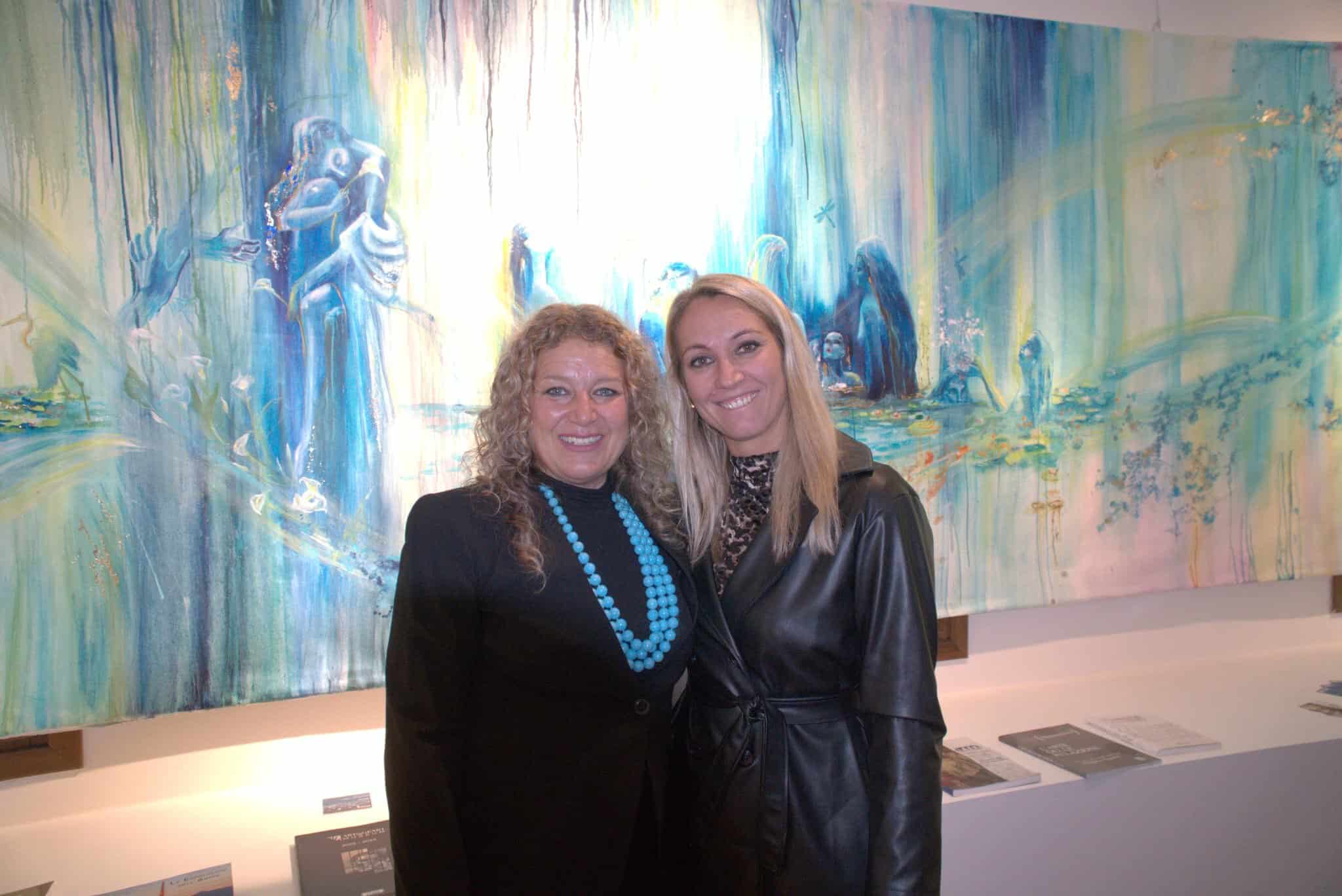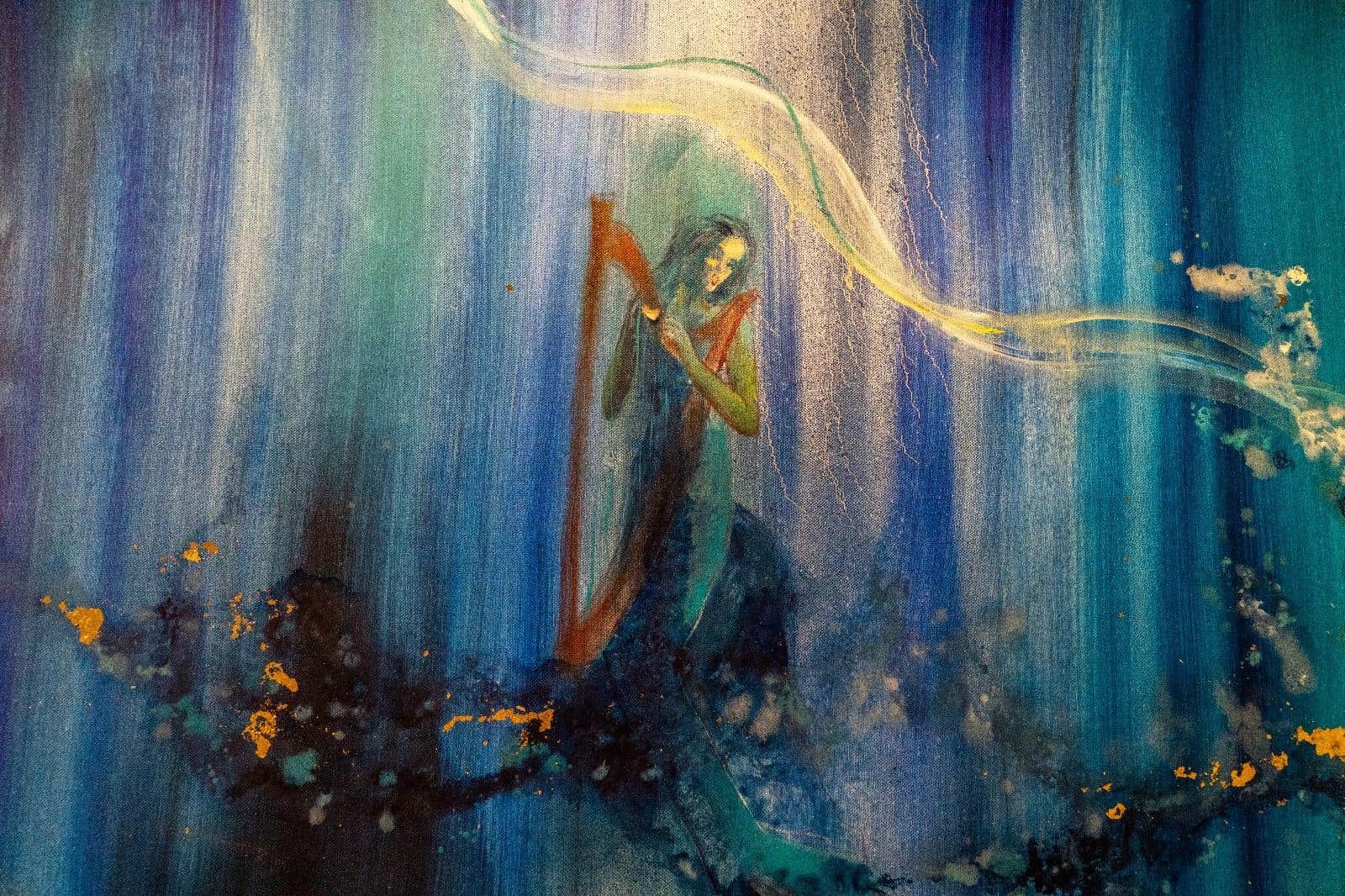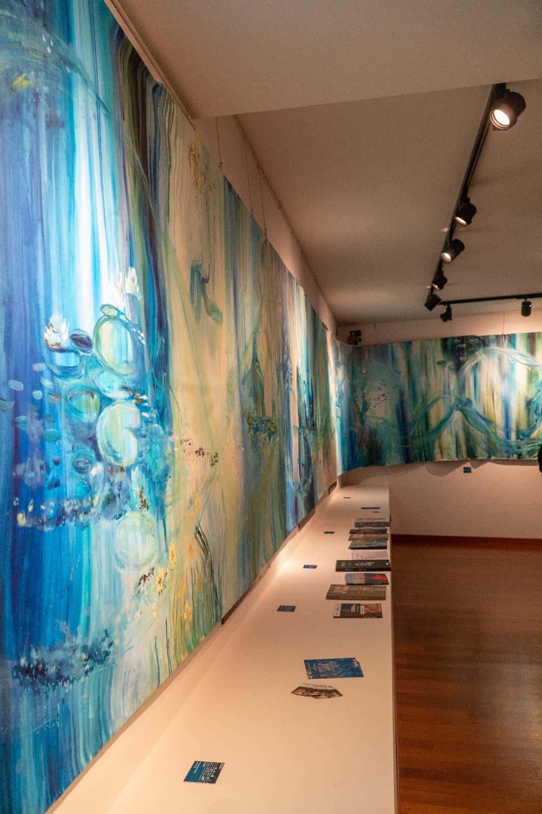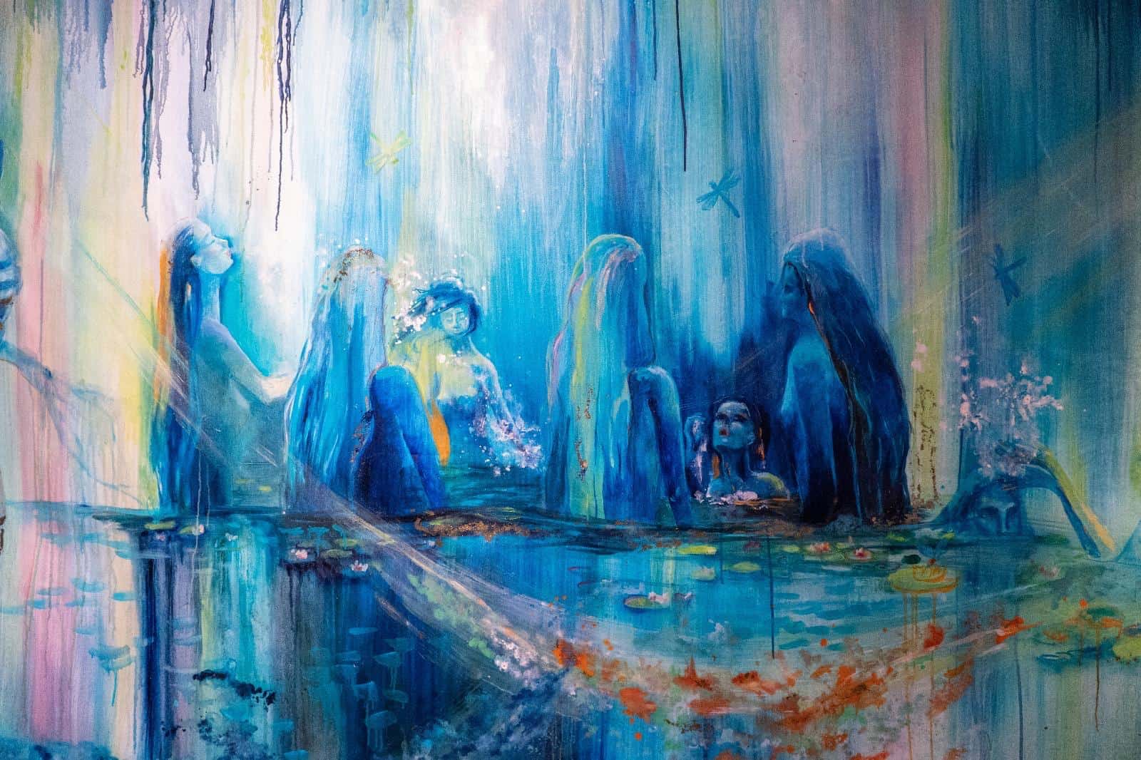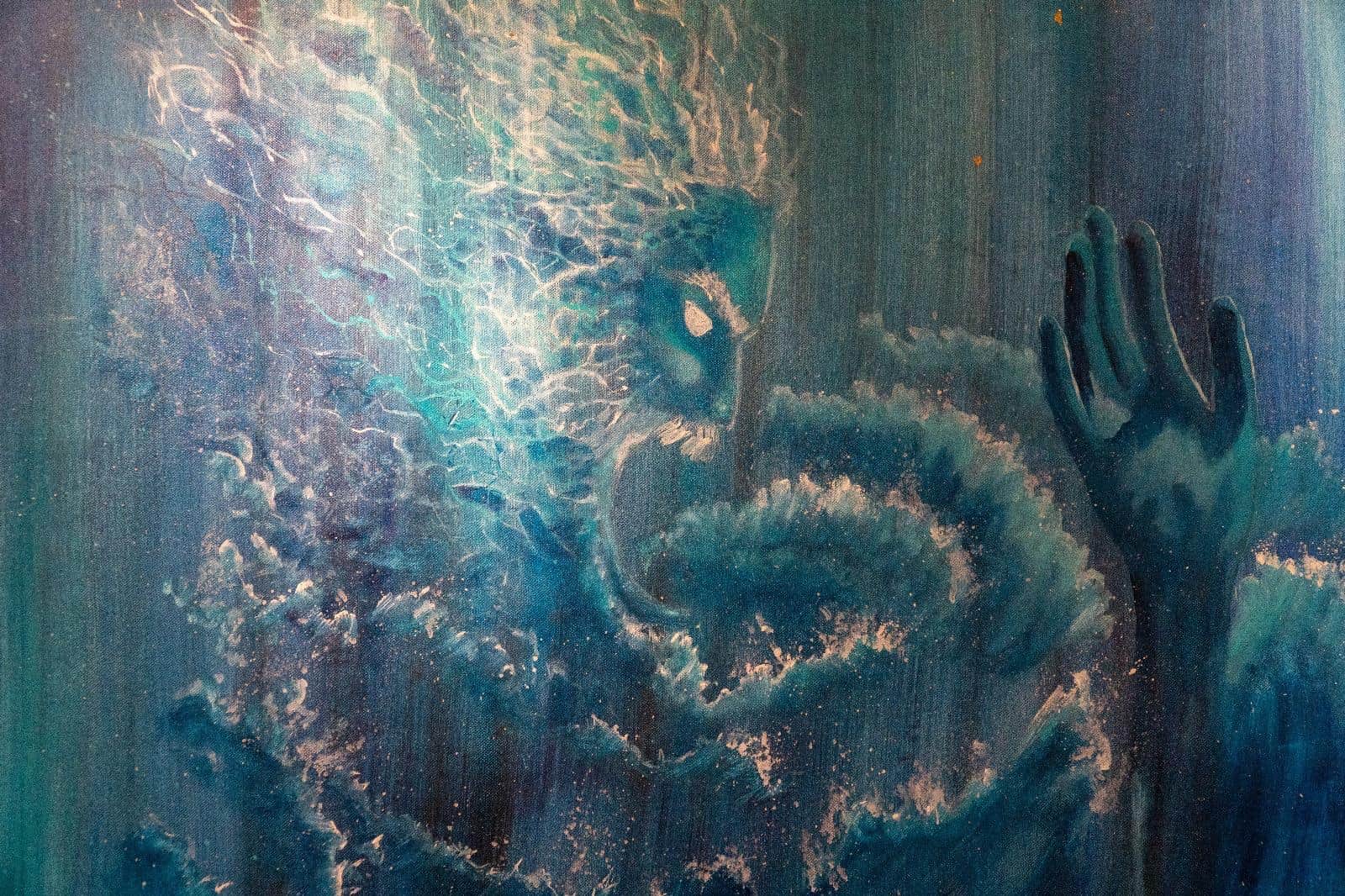 Profonda e coinvolgente la spiegazione dell’opera da parte dell’autrice e dello storico e critico d’arte Siro Perin: davanti a questa distesa pittorica, tutto comincia a scorrere, l’acqua diventa metafora della vita, della trasformazione, della memoria. Da Oceano e Teti fino a Ulisse, passando per Dafne, Aretusa, Narciso, le Nereidi, Scilla e Cariddi, ogni figura mitologica emerge e si dissolve in un paesaggio liquido, dove il blu, il turchese e il verde acqua si fondono in dissolvenze oniriche.