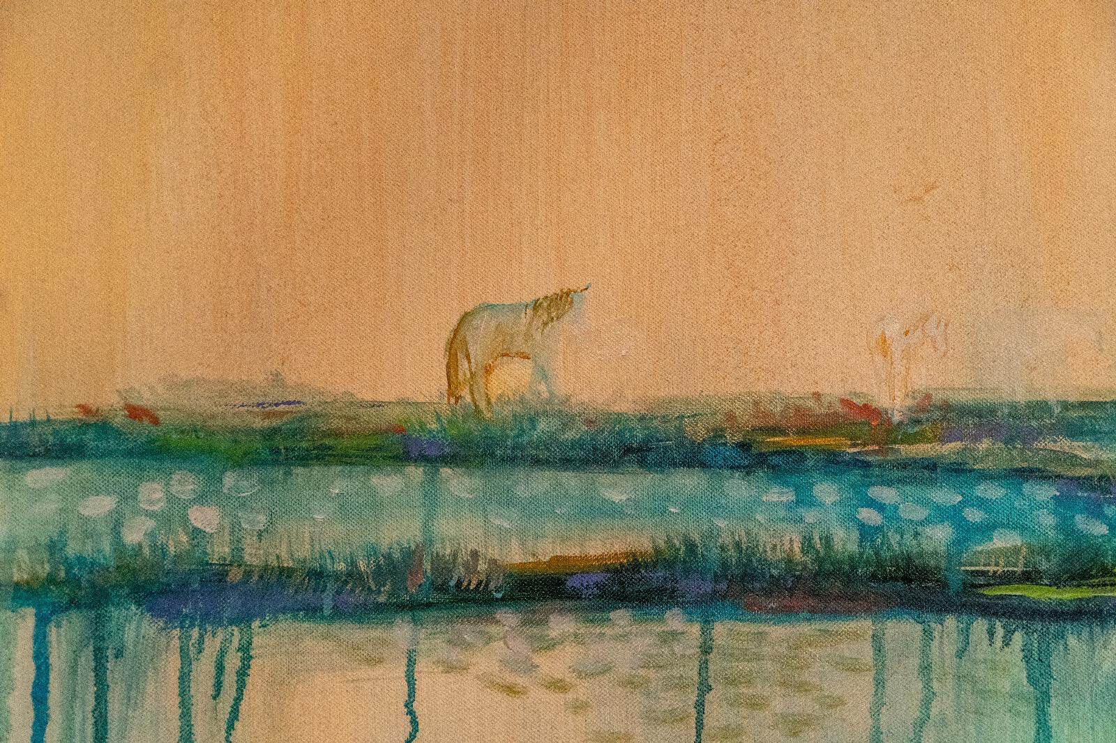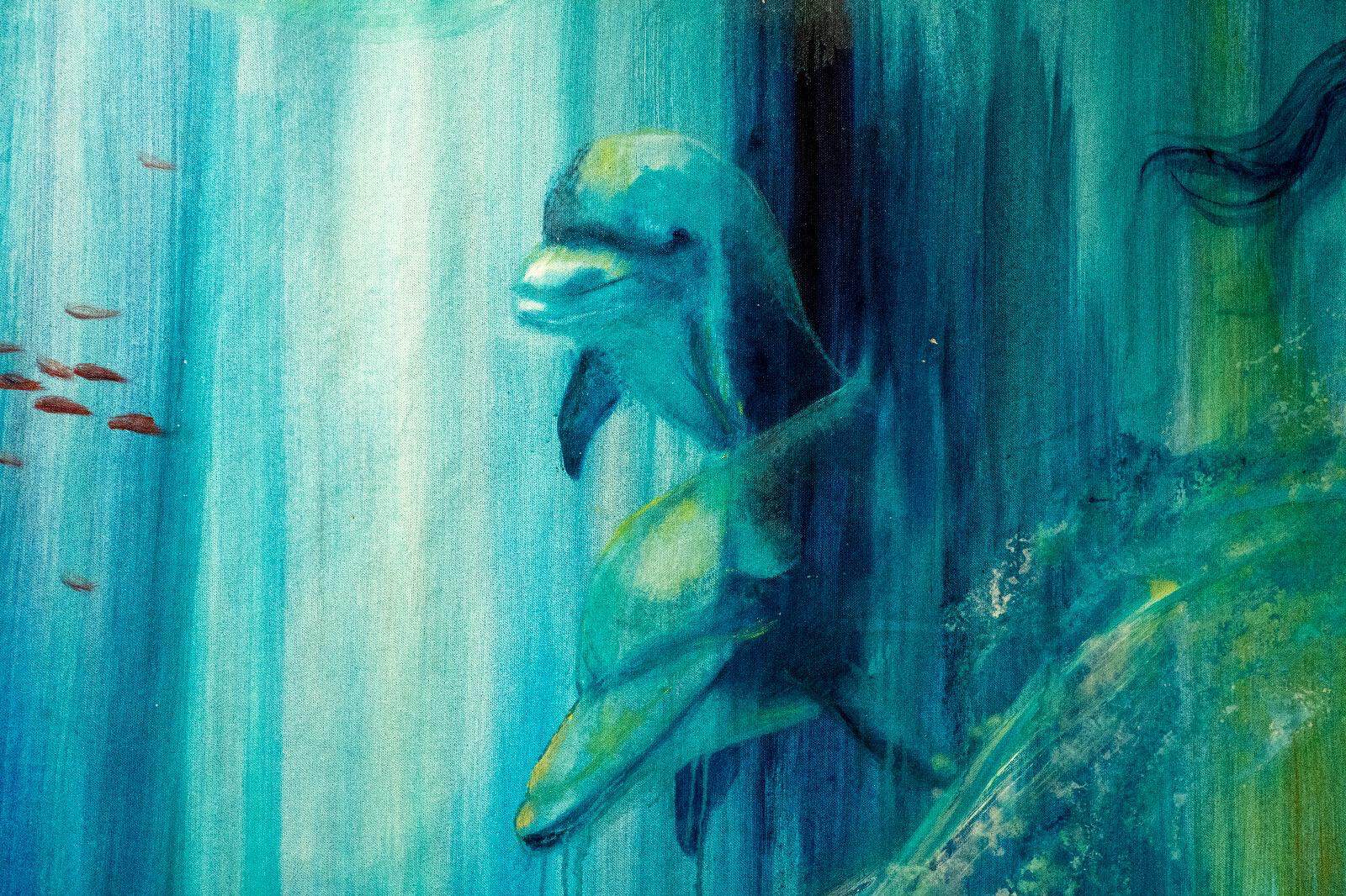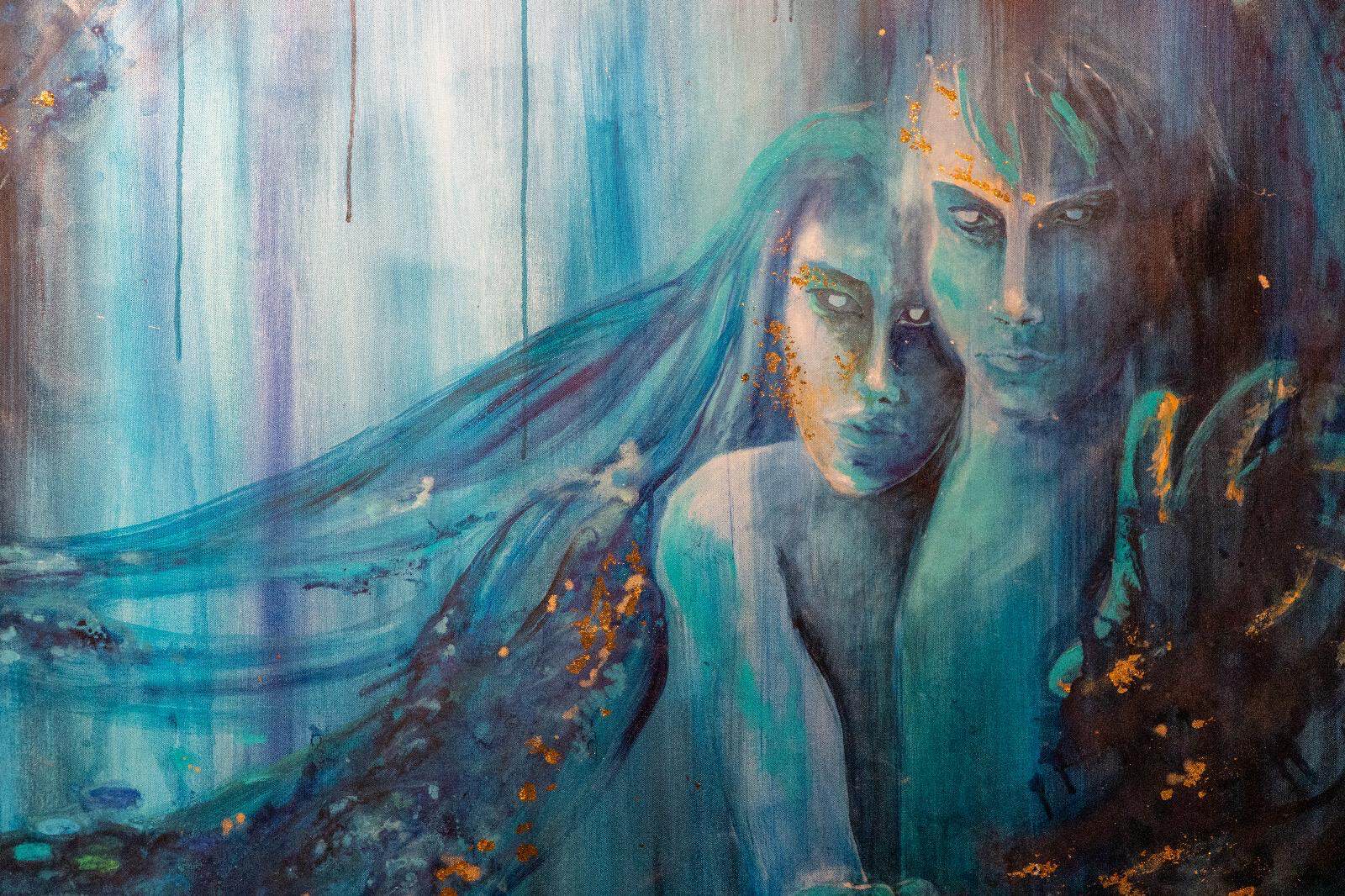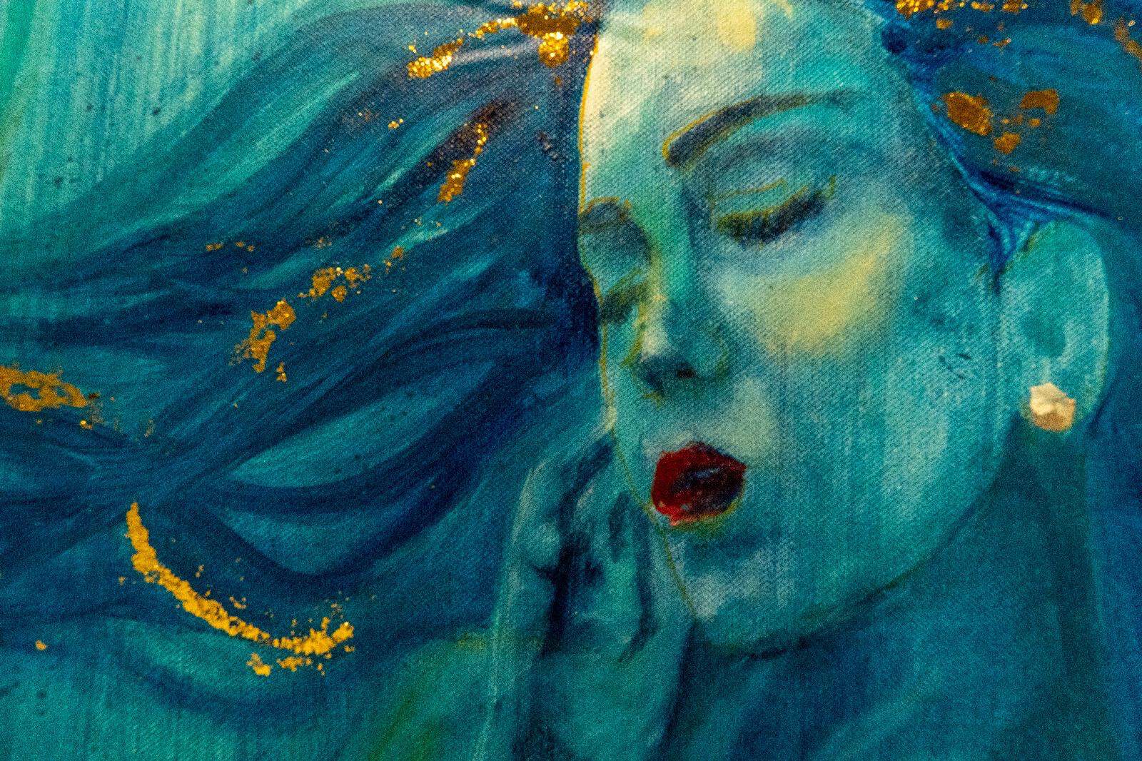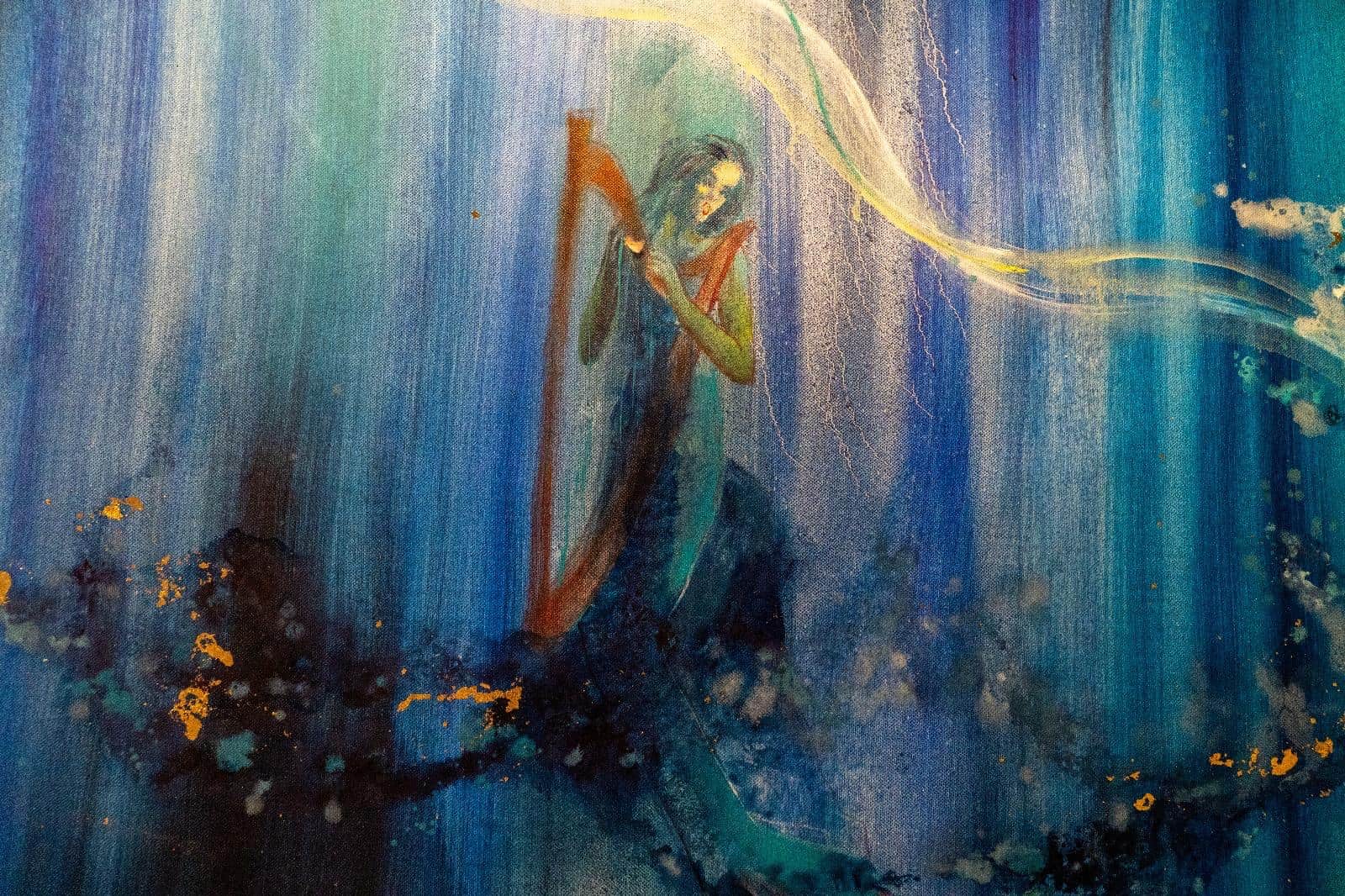 Profonda e coinvolgente la spiegazione dell’opera da parte dell’autrice e dello storico e critico d’arte Siro Perin: davanti a questa distesa pittorica, tutto comincia a scorrere, l’acqua diventa metafora della vita, della trasformazione, della memoria. Da Oceano e Teti fino a Ulisse, passando per Dafne, Aretusa, Narciso, le Nereidi, Scilla e Cariddi, ogni figura mitologica emerge e si dissolve in un paesaggio liquido, dove il blu, il turchese e il verde acqua si fondono in dissolvenze oniriche.
