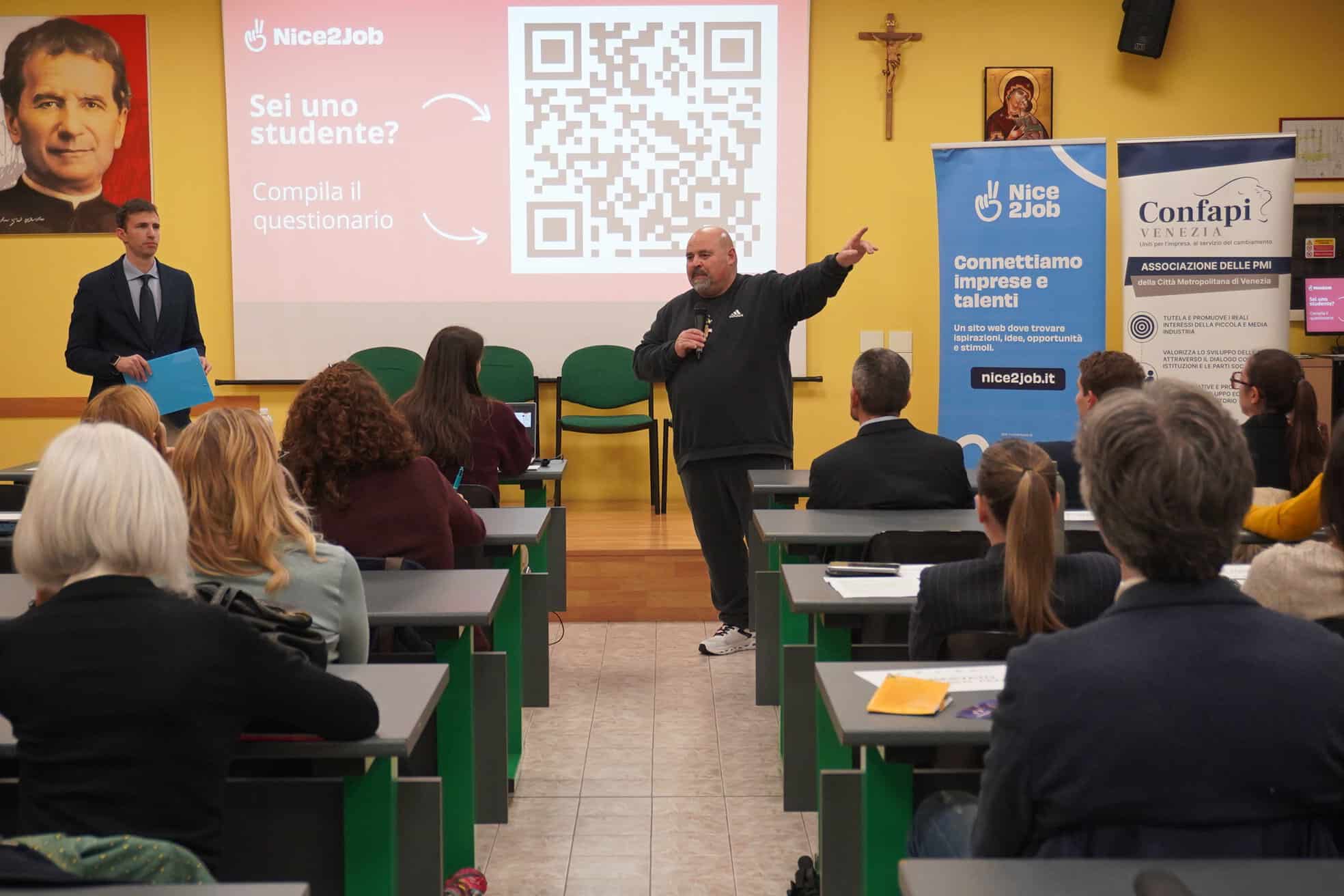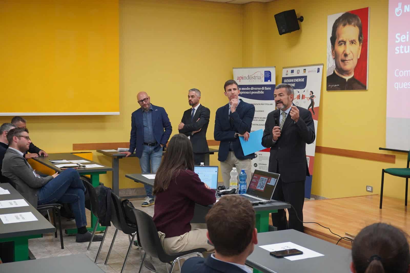 L’iniziativa ha avuto il pregio di far dialogare gli imprenditori con studenti e studentesse delle quarte e quinte superiori. A spiegare finalità e obiettivi delle molteplici attività messe in campo è stato Nicola Zanon, Amministratore di Apindustria Servizi. Presenti all’appuntamento un centinaio di persone, unitamente ad autorità e istituzioni. A portare i saluti Alessandro Ferro, direttore della Scuola di Formazione Professionale “Don Bosco”, il direttore generale don Nicola Munari, Alberto Teso, sindaco di San Donà di Piave e Lucas Pavanetto in rappresentanza della Regione del Veneto.