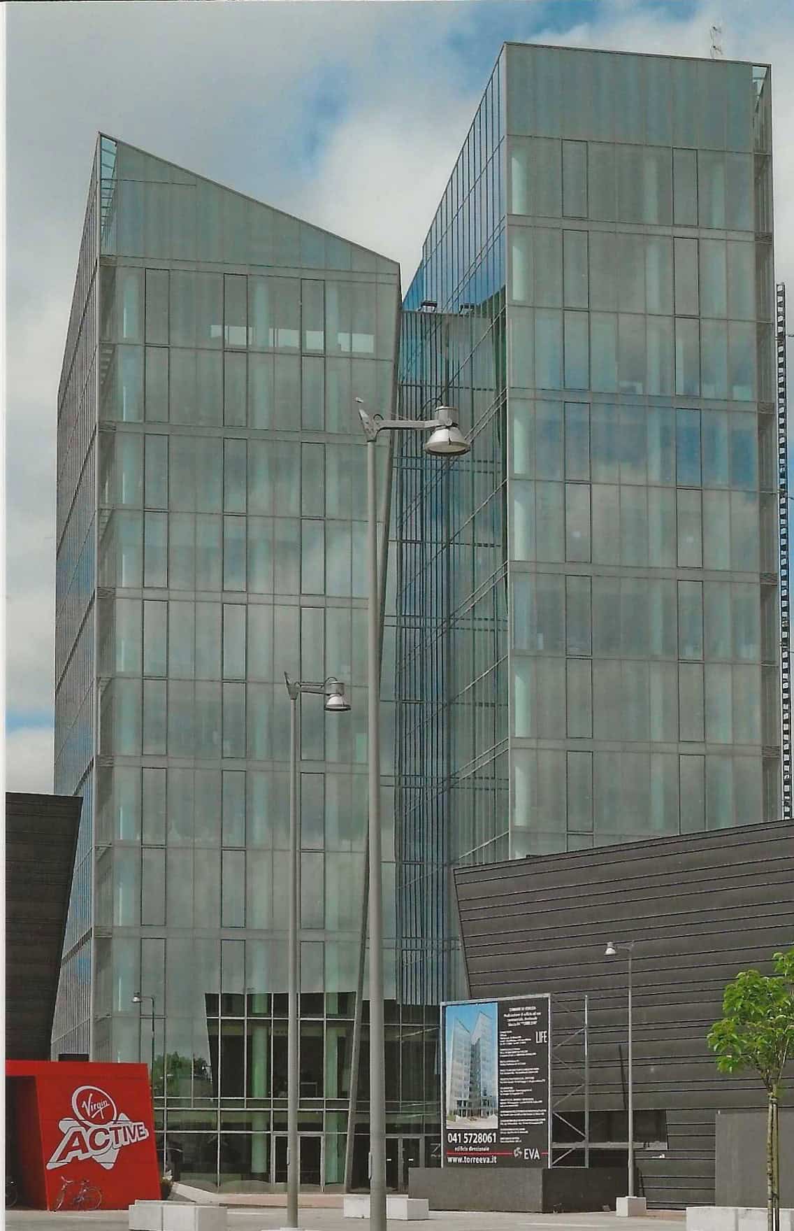 Proseguendo verso Nord appare l’edificio “tutto vetro” di undici piani, conosciuto come “Torre Eva”, con parcheggi a raso (studio architetti Mar).