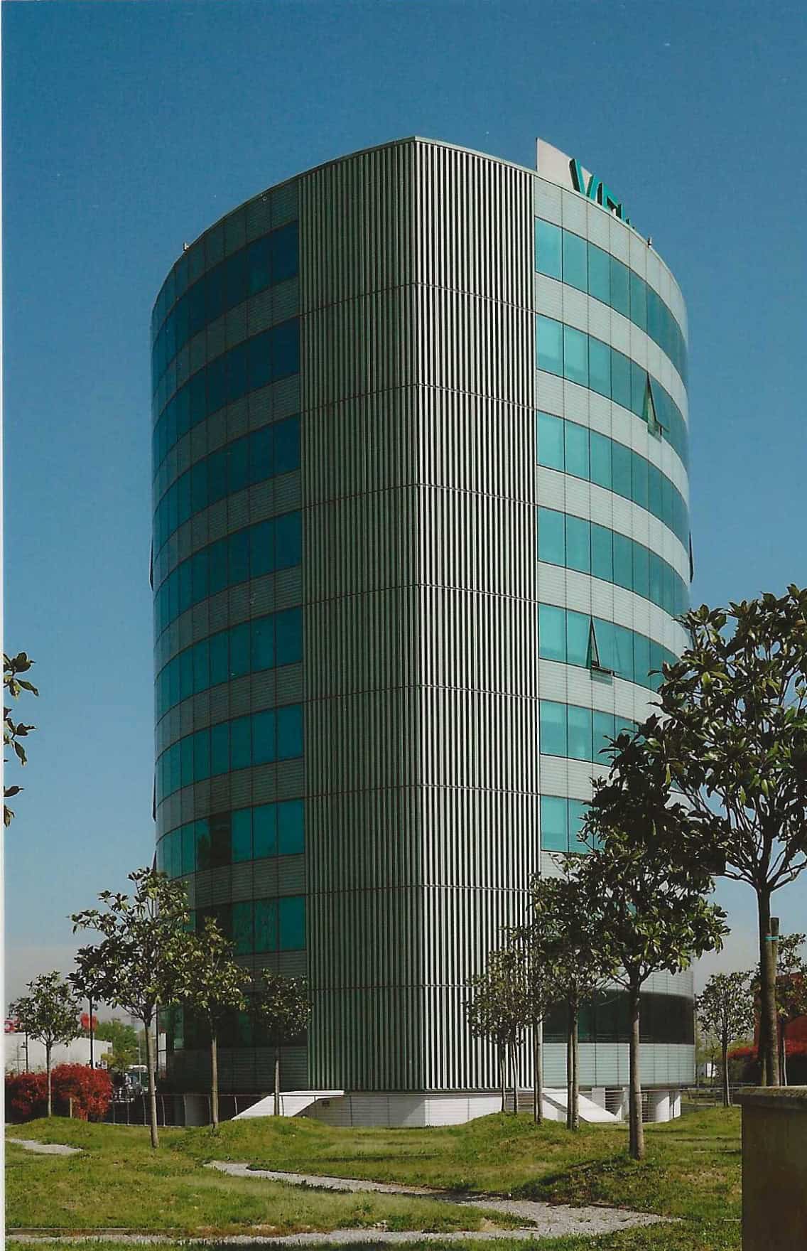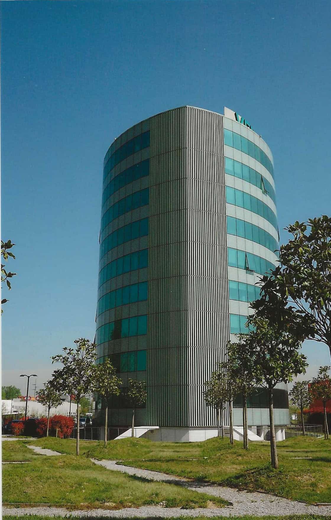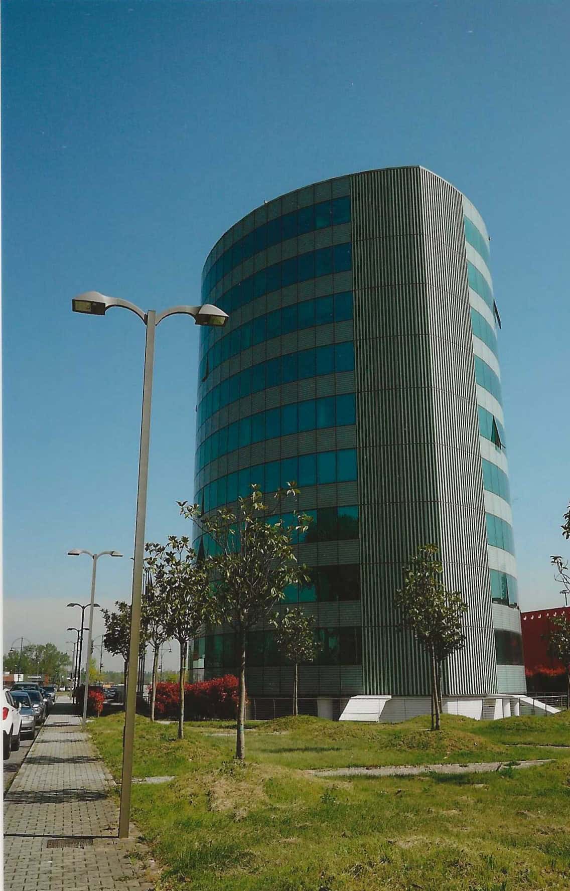 Proseguendo ulteriormente verso Nord appare l’imponente mole di un edificio di nove piani, oltre al piano terra e al garage sotterraneo. Adibito ad uffici, caratterizzato dalla base a forma di ellissi che si estende per tutta l’altezza, determinando l’accennata “imponenza” (architetto Ruggero Artico).
