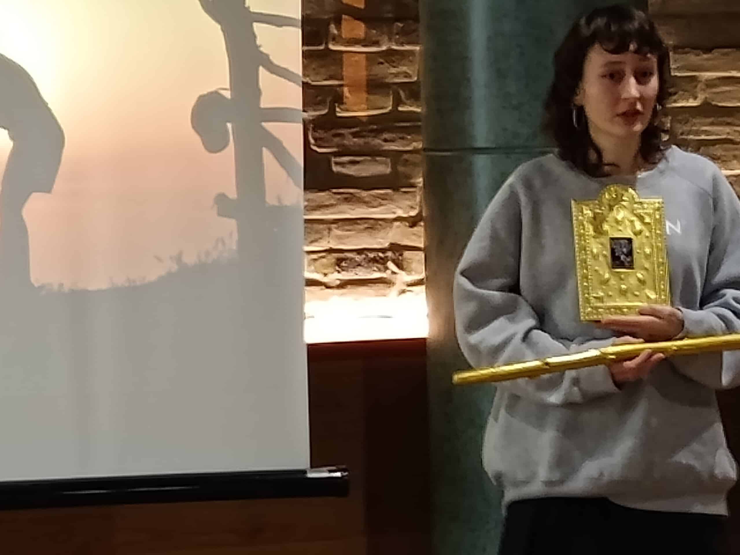 Emira Plevirovitc, scultrice che ha preso ispirazione dalle tracce tipiche del Carso utilizzando elementi naturali e il suo feedback. Ne è nato un arazzo utilizzando il colore del vino e la lana tinta con i colori del Caro in autunno.