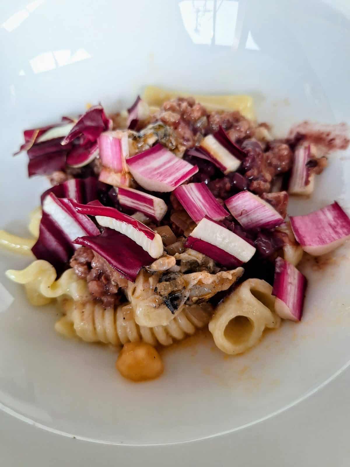 Ingredienti (per 4 persone): 20 ostriche, 200g di pasta dura mista, brodo di algakelp, acqua di ostriche, grasso maturato e inacidito, finta salsiccia di fagioli borlotti, concentrato di radicchio rosso di Treviso (asciugato in forno, frullato e setacciato), foglie di radicchio di Treviso, 200g di cipolla, olio evo, 100g di concentrato di pomodoro (per il sugo alle ostriche), chiodi di garofano, cannella.