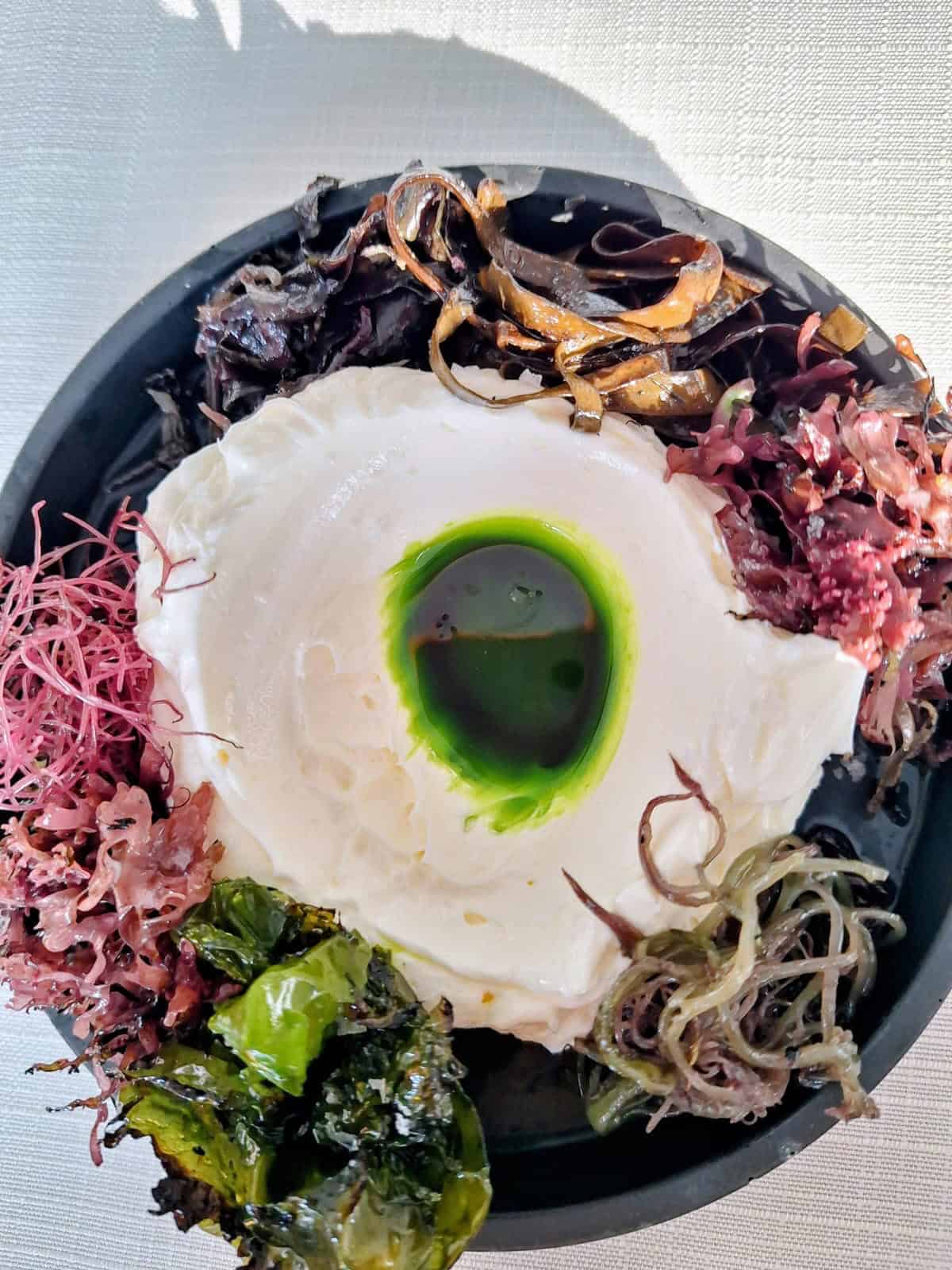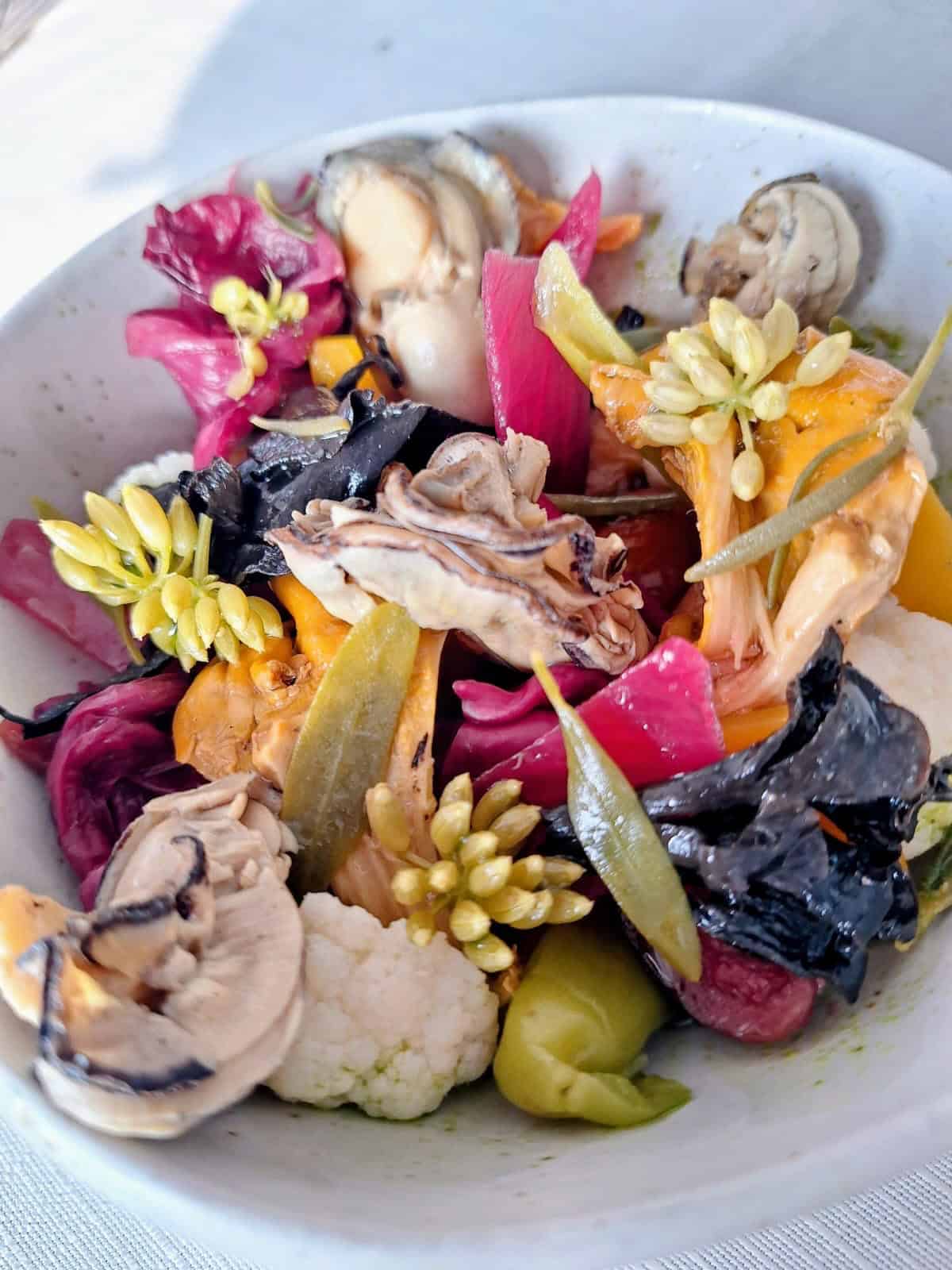 Preparazione. Il brodo deve essere preparato il giorno prima, si procede poi all’ebollizione delle alghe e delle ostriche. Realizziamo poi la salsiccia di fagioli che devono restare in ammollo per 24 ore, il tutto deve essere amalgamato. Prepariamo il sugo di ostriche alla marinara con cipolla, olio evo e il concentrato di pomodoro. Procediamo poi a cucinare la pasta mista al termine inseriamo il radicchio di Treviso a pezzetti. Impiattiamo il tutto.