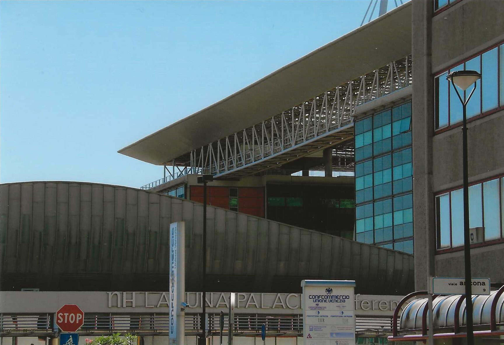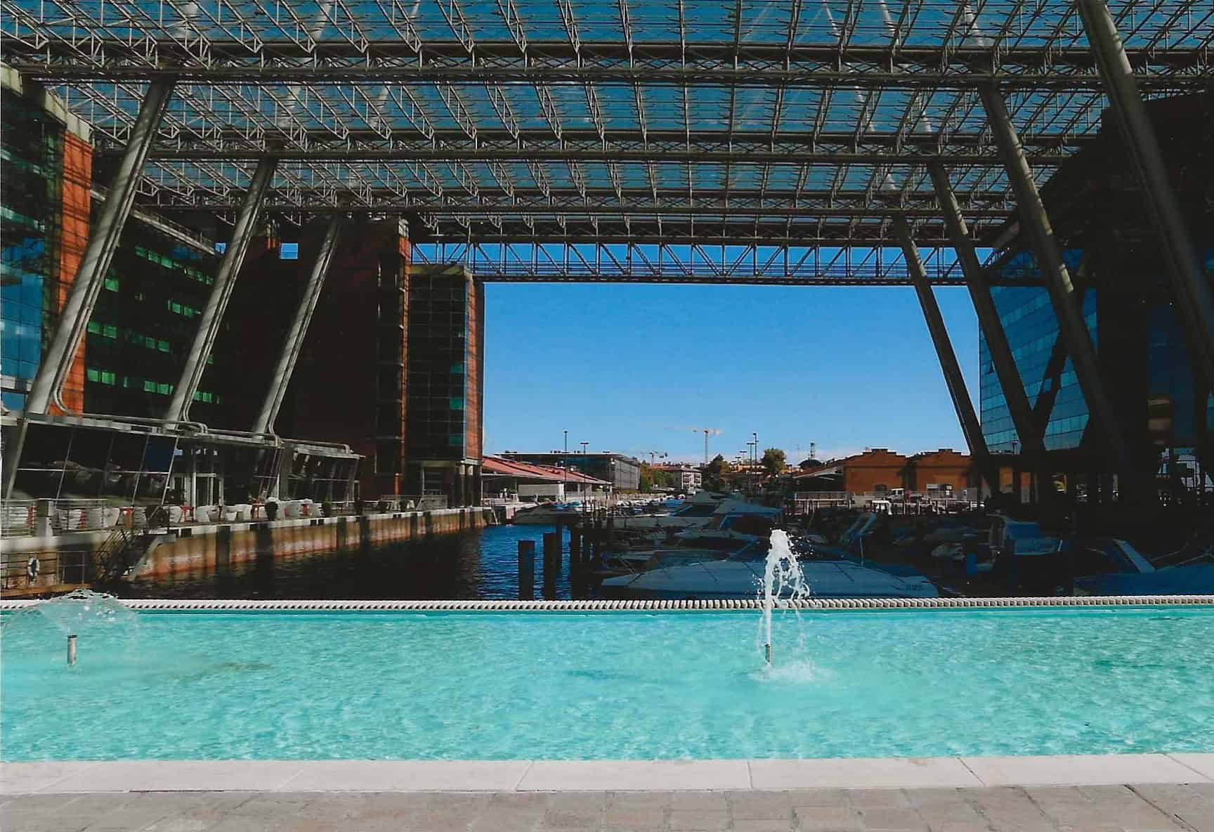 Non minore fu la complessità tecnologica: invero tra i due corpi di fabbrica, di 9 piani (oltre il sotterraneo per garage), risulta inserita una darsena per il trasferimento degli ospiti dell’Hotel diretti a Venezia attraverso il Canal Salso (altra fonte di problemi peraltro solo tecnici e risolti con le diverse Amministrazioni pubbliche); nonché il collegamento con il sistema stradale (Viale Ancona) e con le fonti energetiche, come si dirà in appresso.