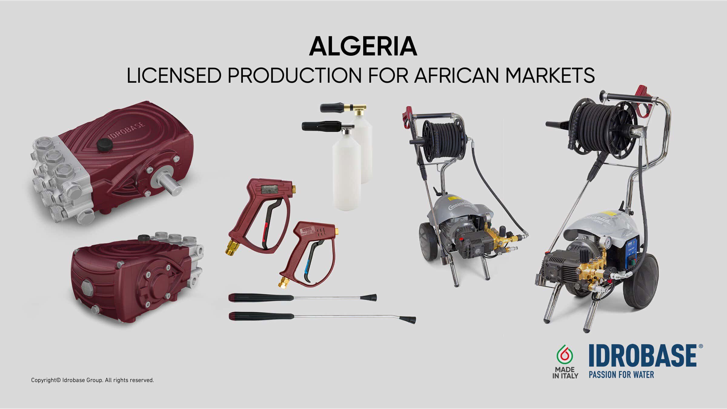 Di fronte alla crisi mondiale e forte dei confortanti risultati in un continente frequentato da anni, prosegue l’impegno della veneta Idrobase Group (leader internazionale nella produzione di tecnologie per l’utilizzo dell’acqua in pressione) nella costruzione del nuovo obbiettivo imprenditoriale di trasferire parte della produzione dalla Cina (stabilimento di Ningbo) all’Algeria per sviluppare il mercato africano; i tre contratti già firmati con altrettante aziende locali per produzioni su licenza sono in attesa del via operativo da parte delle Autorità algerine: il primo riguarda i componenti per aspirapolveri professionali, mentre il secondo interessa i detergenti per autolavaggi (car wash), hotel e ristoranti (HoReCa); il terzo contratto è finalizzato ai componenti per idropulitrici professionali.