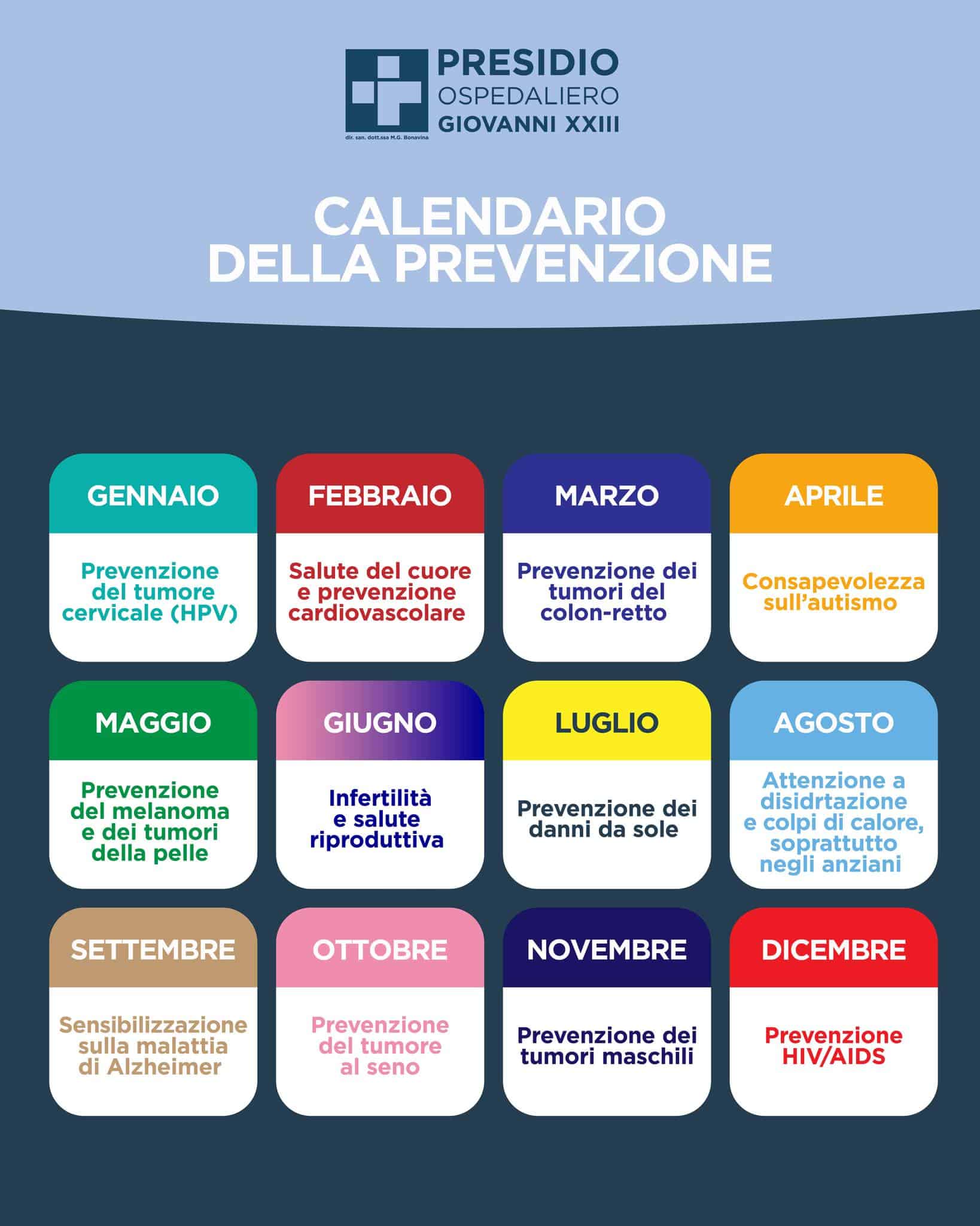 - Agosto – Azzurro: prevenzione di disidratazione e colpi di calore (focus anziani)