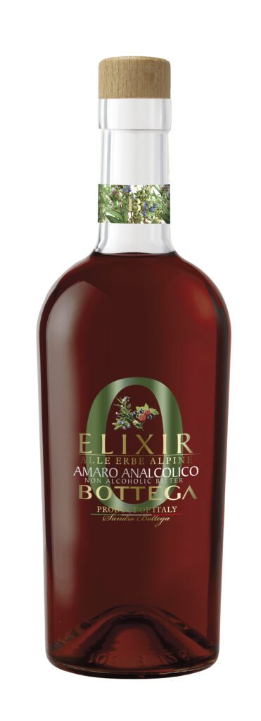 Elixir Amaro 0% Bottega, un amaro analcolico che si rifà alla grande tradizione degli amari alle erbe, di cui mantiene la complessità aromatica e a cui aggiunge la leggerezza di una bevanda analcolica. Perfetto da bere in qualsiasi momento della giornata, da solo o come ingrediente di gustosi Cocktail.