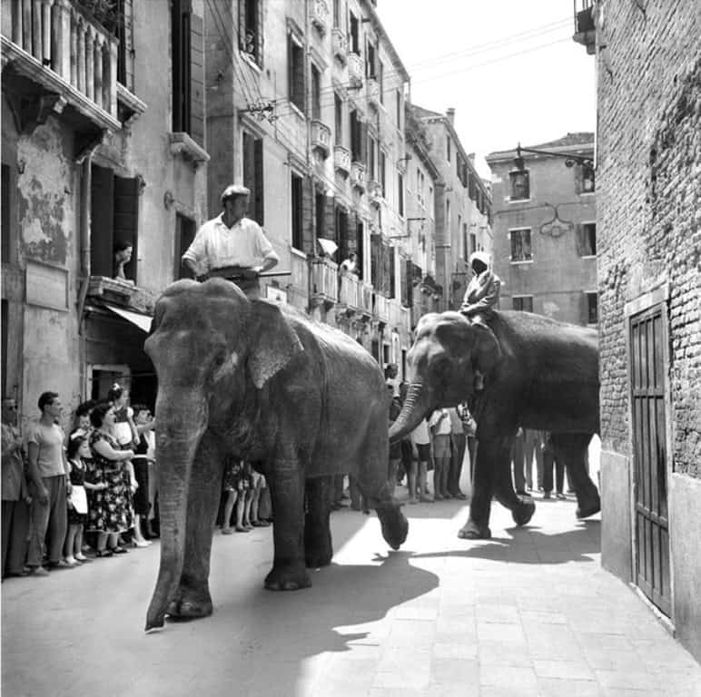 Non è proprio un negozio per turisti, ma tanti turisti si fermano con curioso interesse. É la vetrina, doverosamente in bianco e nero, di Cameraphoto, sestiere di Castello, in prossimità della conosciuta Barbaria de le Tole. Sono in mostra tutte le immagini, ma nessuna a colori, con grandi artisti e attori famosi della Biennale o della Mostra del Cinema, e non solo. Oppure desta curiosità la passeggiata di alcuni elefanti che attraversano i ponti per andare al circo. Siamo nella Venezia degli anni Cinquanta.
