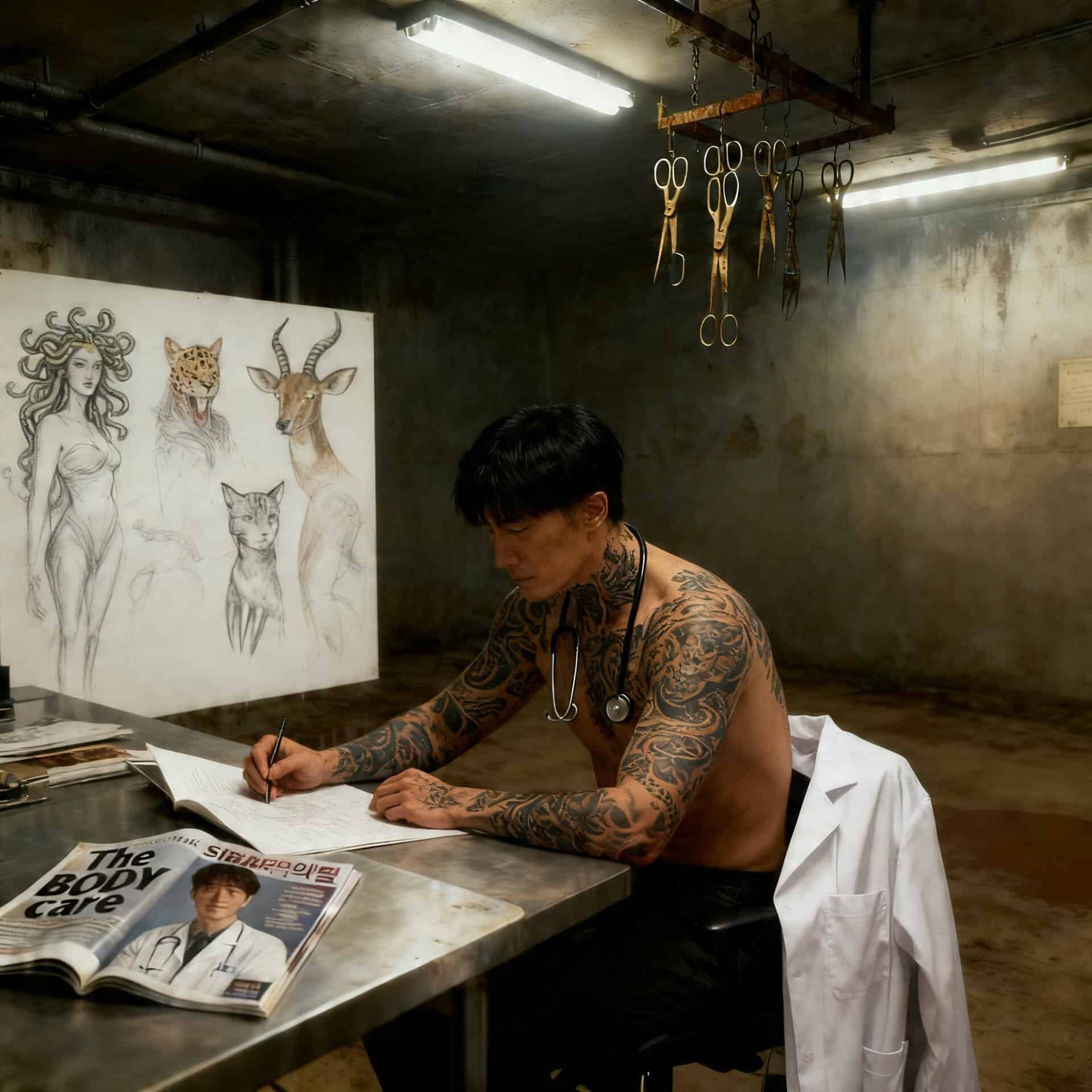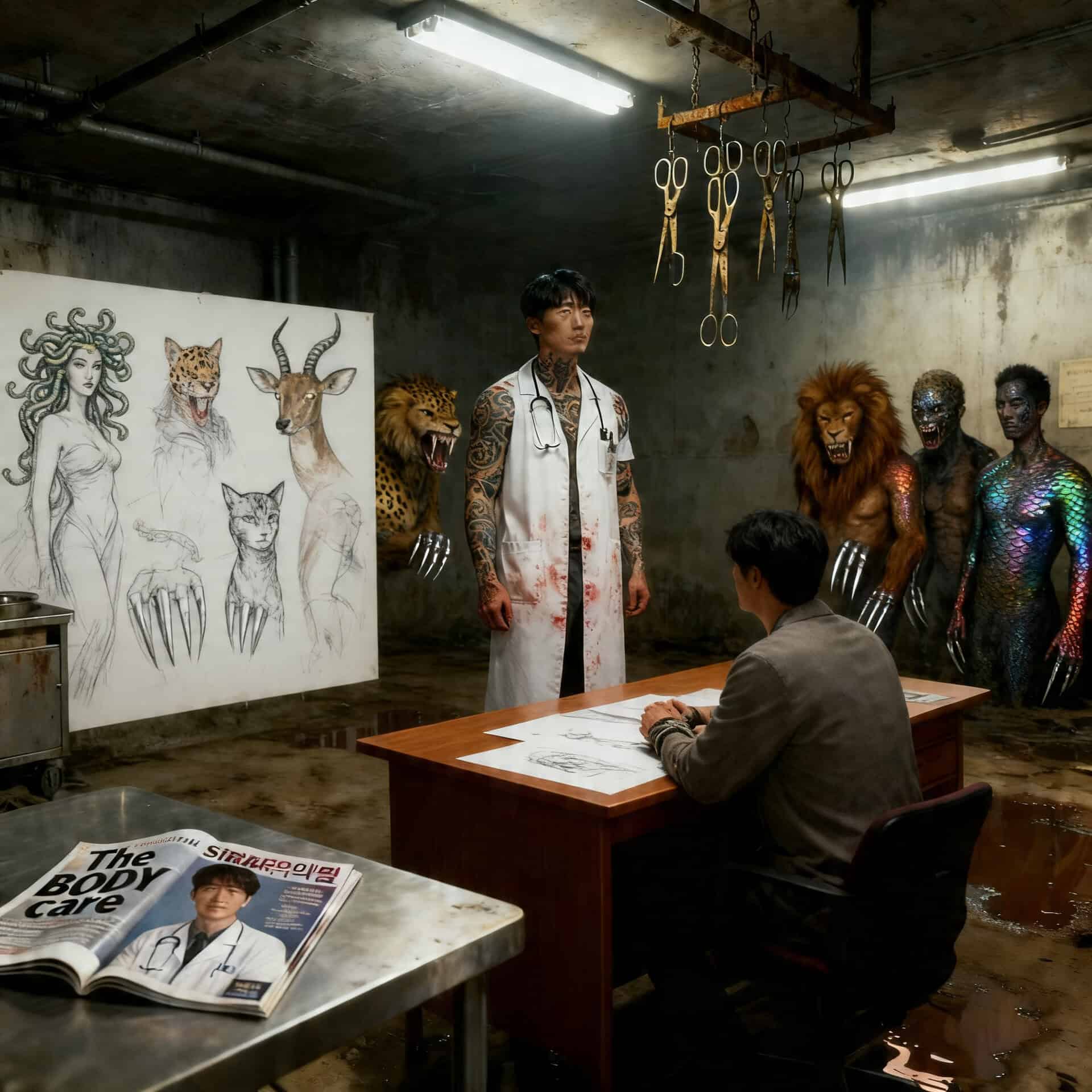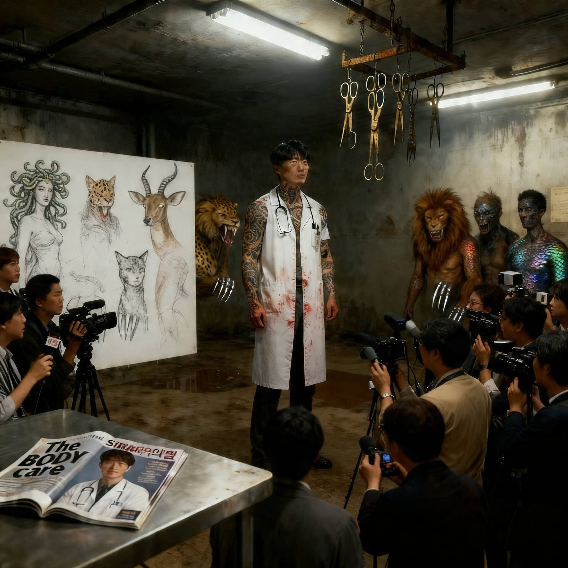 Si parte dalla morbosa attenzione che un medico e artista coreano, il Dr Kim di Seul, ha avuto per il corpo umano sottoposto a tatuaggio che era, all’inizio della sua carriera una forma di pittura corporea, un’occasione “per esprimere ogni tipo di emozioni”. Ma l’estetica non bastava all’immaginazione di Kim: si poteva, anzi si doveva fare di più. Così si è inventato la trasfigurazione della pelle che nelle sue intenzioni, lo avrebbe reso ricco e famoso nel mondo.