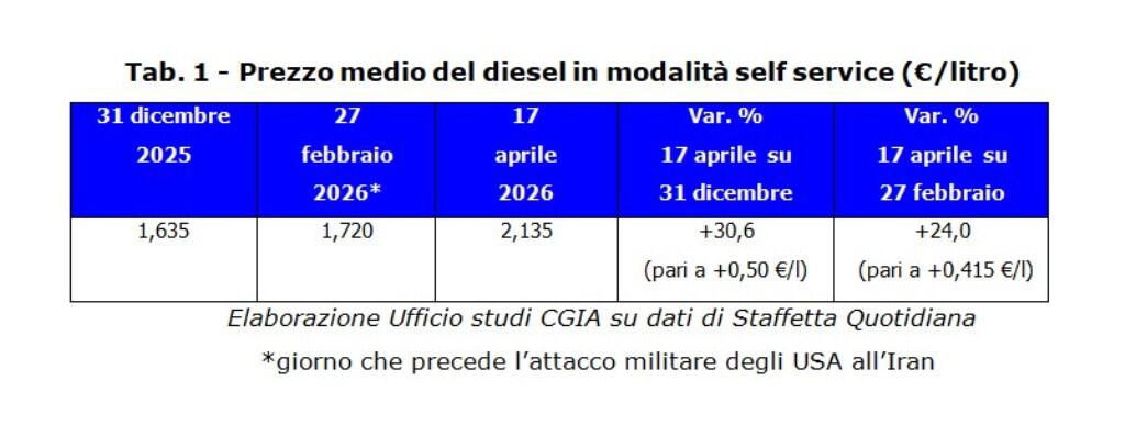 Il prezzo del diesel alla pompa in modalità self oggi è mediamente pari a 2,135 euro al litro. Nonostante il taglio delle accise deciso dal governo Meloni e prorogato fino al prossimo inizio di maggio, rispetto all’inizio della guerra nel Golfo l’incremento di prezzo è stato del 24 per cento (+0,415 euro al litro). Ma se il confronto lo facciamo con il 31 dicembre scorso, il rincaro è stato addirittura del 30,6 per cento (+0,50 euro al litro). Considerato che un serbatoio di un mezzo pesante contiene circa 500 litri di gasolio, oggi ad un autotrasportatore fare il pieno al proprio Tir costa 1.067 euro, 207 euro in più rispetto ad un mese e mezzo fa e 250 euro in più se la comparazione viene eseguita con la fine dell’anno scorso (vedi Tab. 1).