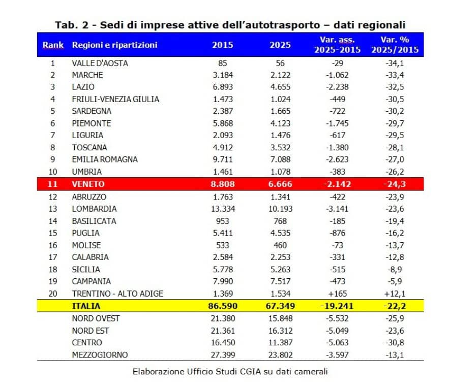 Come dicevamo più sopra, le difficoltà del settore vengono da lontano. Negli ultimi 10 anni, infatti, lo stock complessivo delle imprese attive di autotrasporto presenti in Veneto è diminuito di 2.142 unità. Se nel 2015 erano 8.808, nel 2025 sono scese a 6.666 (-24,3 per cento), due punti percentuali in più della media nazionale (-22,2). A livello regionale le situazioni più critiche si sono verificate in Valle d’Aosta con una contrazione del 34,1 per cento (in valore assoluto pari a -29), nelle Marche del 33,4 per cento (-1.062), nel Lazio del 32,5 per cento (-2.238), in Friuli Venezia Giulia del 30,5 per cento (-449) e in Sardegna del 30,2 per cento (-722). Per contro, l’unica regione che può contare su un saldo positivo è il Trentino Alto Adige con il +12,1 per cento (+165) (vedi Tab. 2). Sicuramente le crisi economiche che si sono succedute in questo periodo hanno contribuito in misura determinante a ridurre la platea delle imprese di questo settore. Senza contare che soprattutto nel Triveneto si è fatta sentire la concorrenza dei vettori stranieri, in particolare di quelli provenienti dai paesi dell’Europa dell’est. Tuttavia, un contributo importante a questo ridimensionamento è ascrivibile anche all’elevato numero di aggregazioni e acquisizioni che si sono verificate in questo ultimo decennio, provocando, in particolare, una forte decurtazione del numero delle imprese monoveicolari. Un cambiamento non del tutto negativo. Anzi. Grazie agli effetti delle crisi e a questi processi di unione aziendale, la dimensione media delle imprese è aumentata e, conseguentemente, è cresciuto anche il livello di produttività dell’intero sistema logistico.