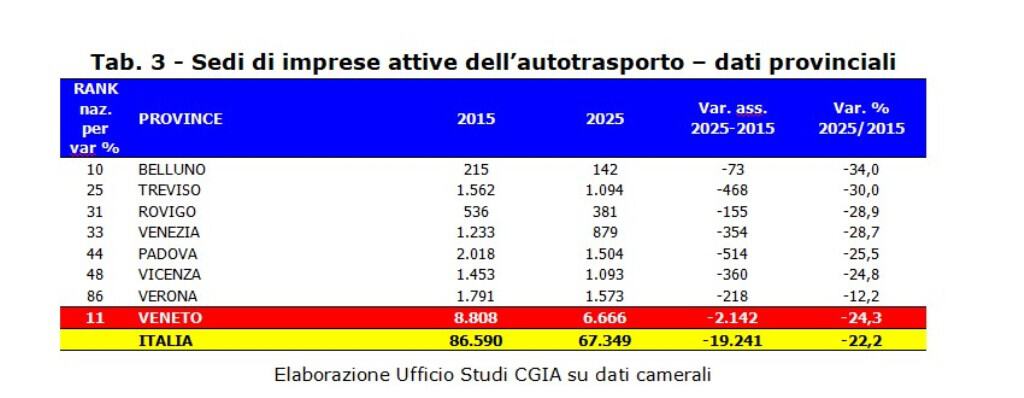 Sempre nel 2025, la realtà provinciale italiana dove si conta il maggior numero di imprese del settore dell’autotrasporto è Napoli con 3.984 attività. Seguono Milano con 3.102 e Roma con 2.854. In Veneto è Verona a registrare il numero di ditte più elevato pari a 1.573 unità. Seguono Padova con 1.504 e Treviso con 1.094. Rispetto a 10 anni fa, invece, è Belluno ad aver registrato la contrazione più elevata pari a -34 per cento (-73 imprese). Seguono Treviso con il -30 per cento (-468), Rovigo con il -28,9 (-155) e Venezia con il -28,7 (-354) (vedi Tab. 3).