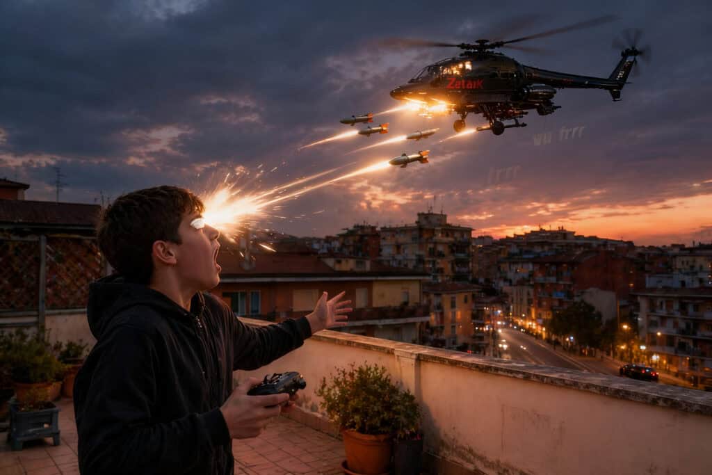 Essendo solo in casa per qualche giorno – il padre vedovo, ma allegro – era fuori con la sua ragazza – avrebbe organizzato una battaglia a sorpresa con la banda dei disprezzati Farlocchi. Arrivato a casa con il suo ambito giocattolo la sorpresa è toccata a lui: non appena lo ha acceso sulla terrazza del condominio, ZetaK si è sollevato per circa venti metri in vertiginosa verticale strappando un grido al ragazzo. È stato un attimo e subito Mirco ha capito che qualcosa non andava per il verso giusto e lo ha richiamato. L’elicottero non obbediva ai suoi comandi, ma si stava comportando come fosse diventato autonomo, o come fosse teleguidato da altri. Forse da quell’uomo oscuro che gli aveva tirato il pacco approfittando della sua età? Alle sue spalle, dopo l’acquisto, il paramilitare aveva sfoderato un ghigno di soddisfazione: e non era per quelle quattro monete incassate: ”Sì, gioca, ragazzo, gioca…” aveva mormorato nella sua lingua.