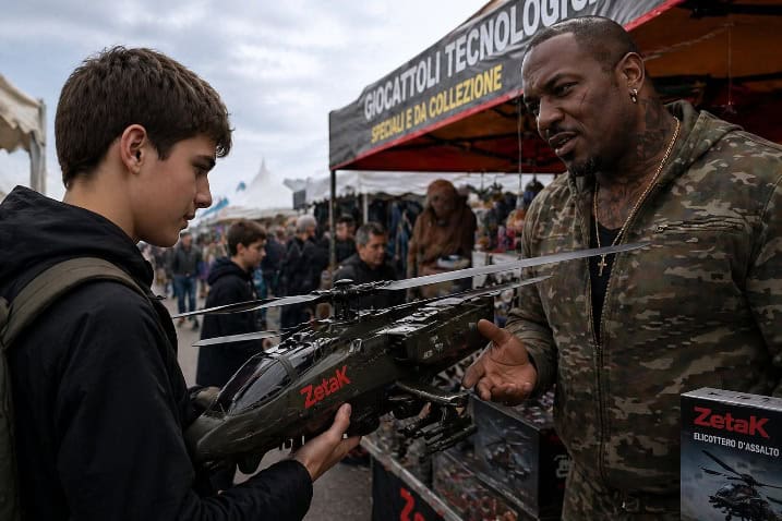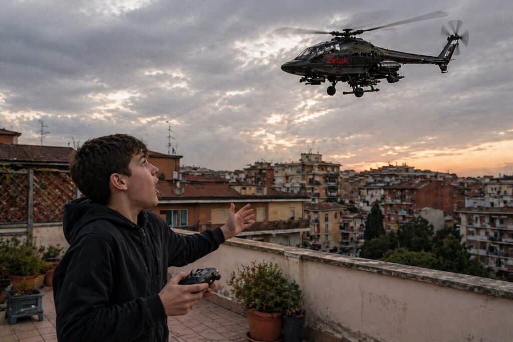 Alla fiera del quartiere, il ragazzo Mirco ha acquistato un giocattolo. Un elicottero “d’assalto”, siglato in rosso ZetaK, piccolo e corposo come un cappone di campagna, perfetto meccanicamente in ogni particolare. Il venditore, tale Robotti Zarro, grosso e scuro di pelle, tuta mimetica, collo tatuato e una cicatrice vicino alla bocca, lo ha magnificato: ”Ah, ottima scelta, già venduti tre stamane mattina!”, con una lunga spiegazione tecnica sul giocattolo “speciale, molto speciale, motore potenziato, altissima tecnologia, vero gioiello, da attivare là fuori, perché lui deve operare in libero spazio. Lui vola bene in piena aria. Capito?”
