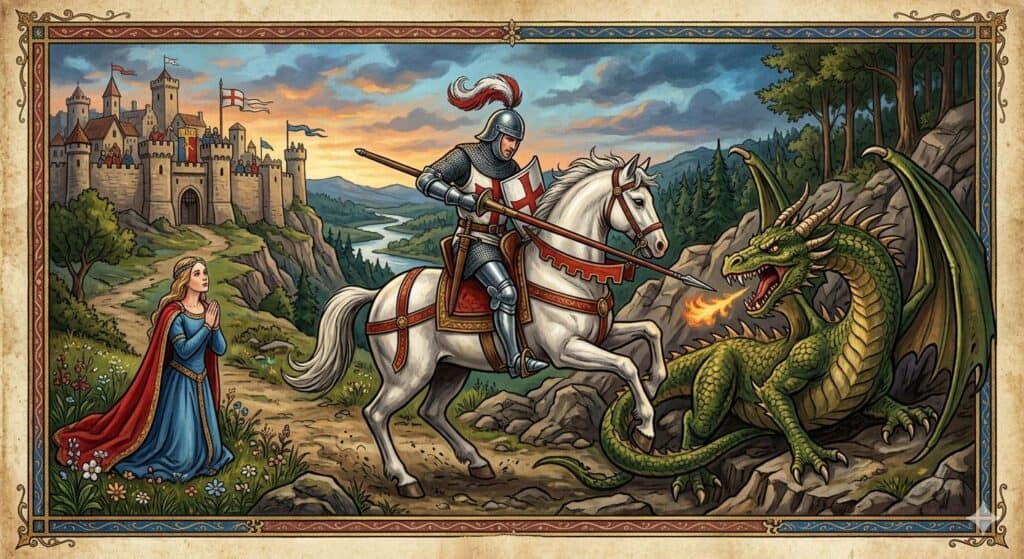 Narra un’antica leggenda catalana, che gli abitanti di un villaggio erano minacciati da un terribile drago. Il valoroso Giorgio lo uccise salvando anche la bella figlia del re. Dallo spruzzo di sangue dell’animale germogliò una rosa che il giovane donò alla fanciulla. Così ogni 23 aprile ogni uomo dona un fiore all’amata, e i librai della Catalogna regalano una rosa per ogni libro acquistato.